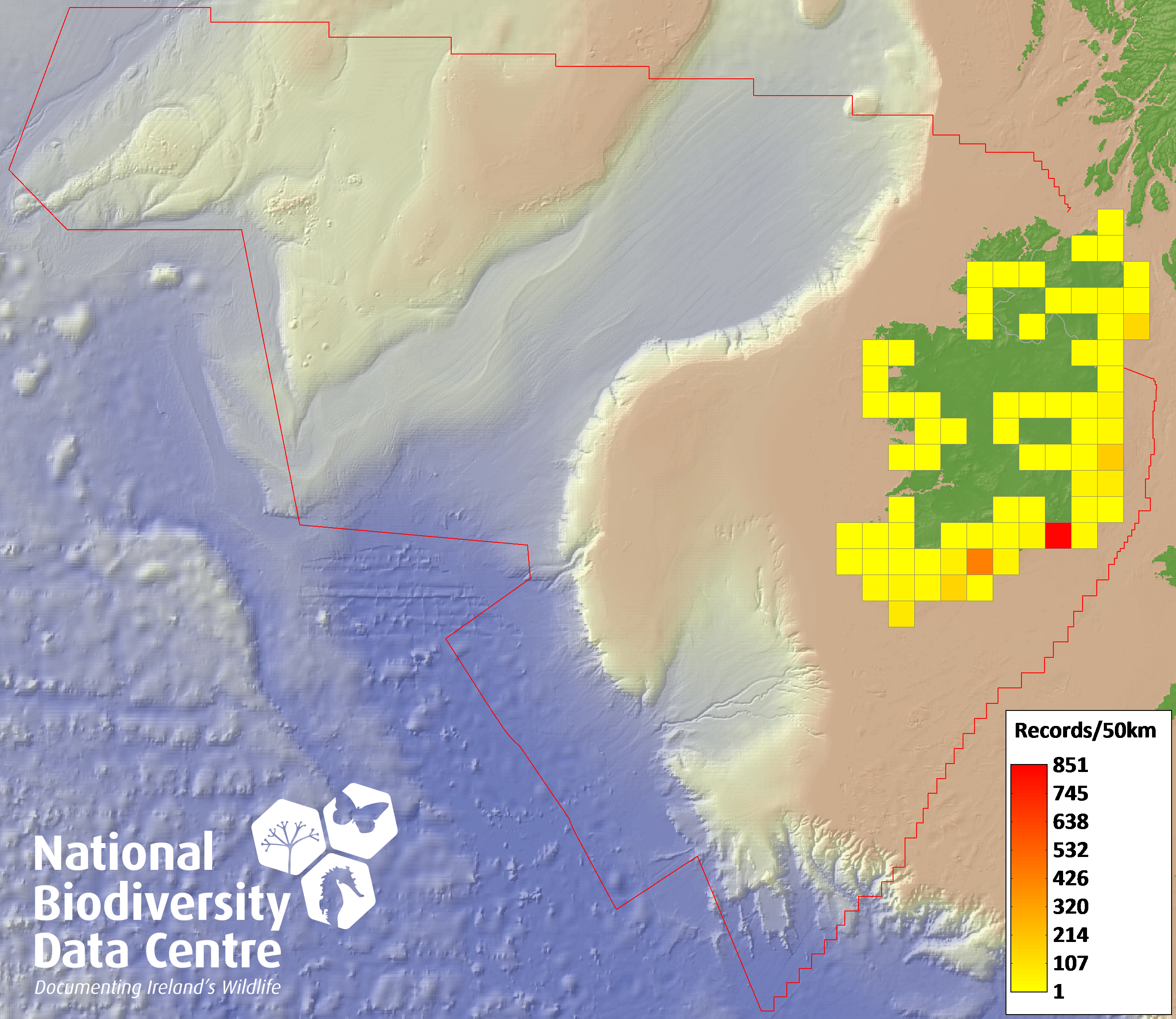 Distribution of the number of records recorded within each 10km grid square (ITM).Marine Map - 50km