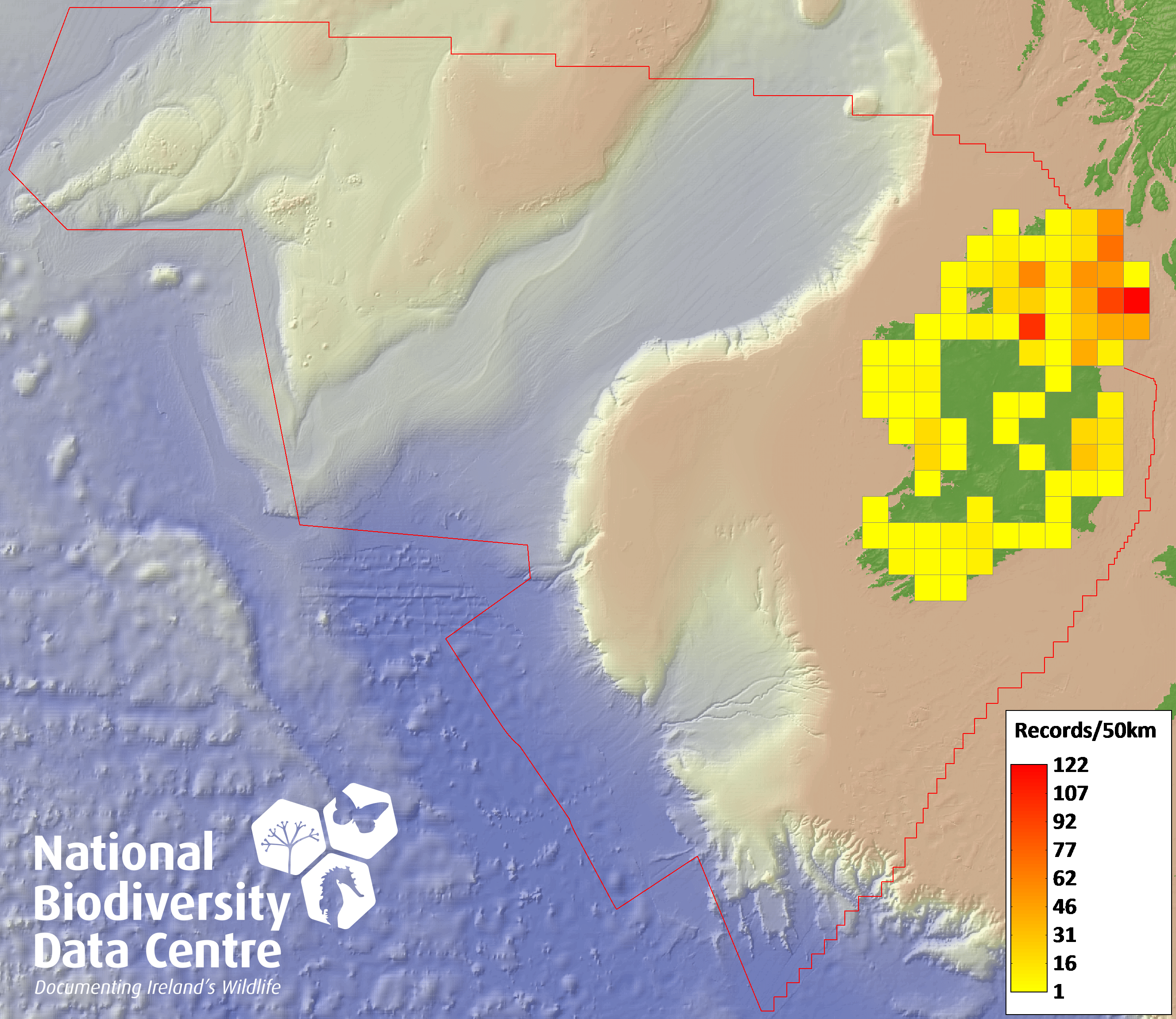 Distribution of the number of records recorded within each 10km grid square (ITM).Marine Map - 50km