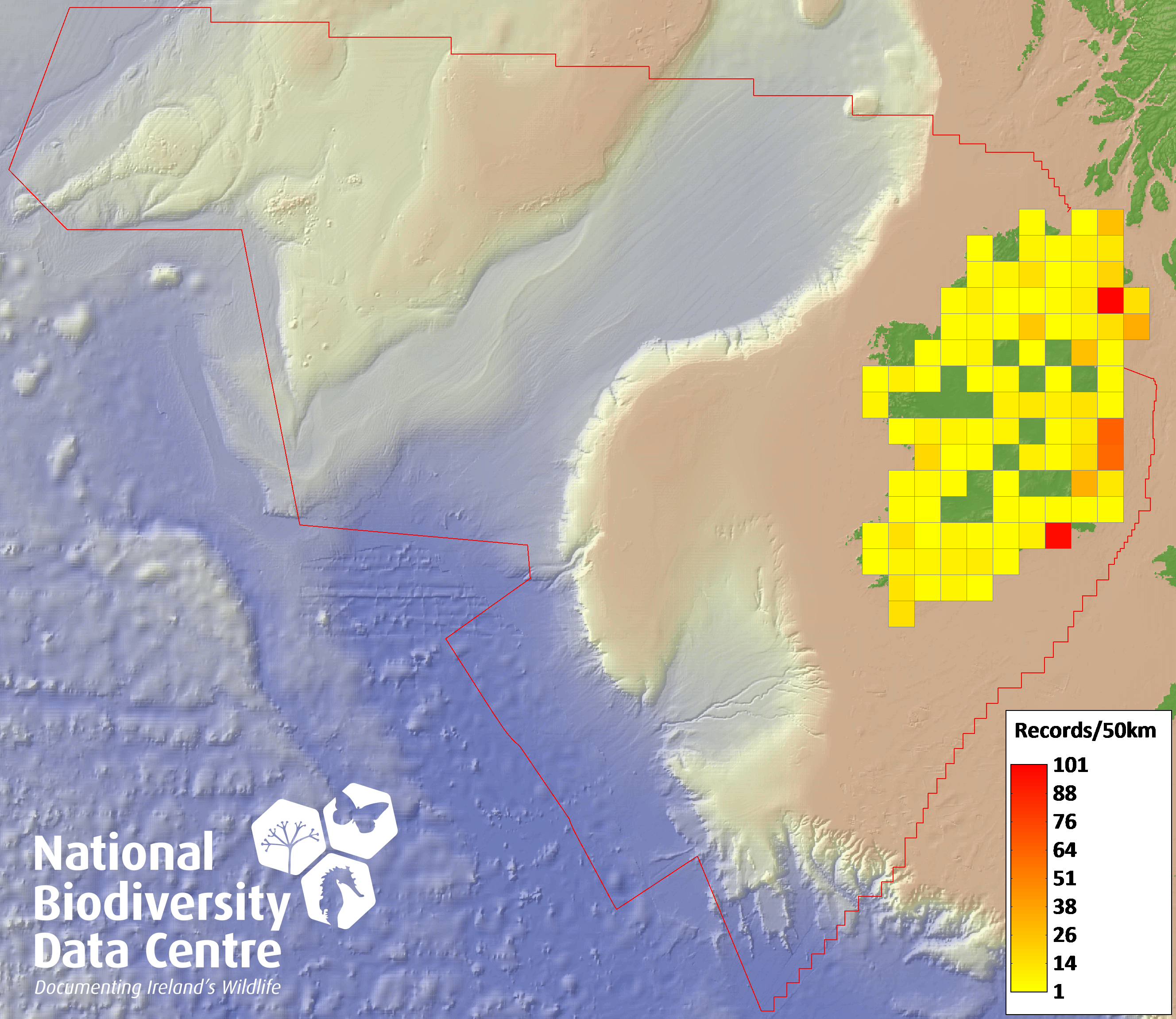 Distribution of the number of records recorded within each 10km grid square (ITM).Marine Map - 50km