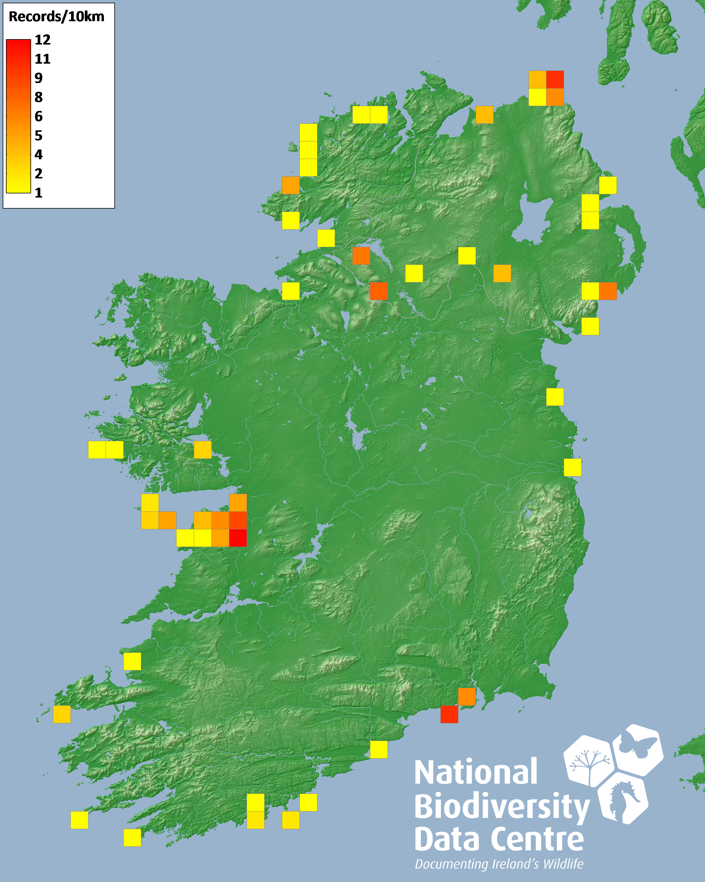 Distribution of the number of records recorded within each 10km grid square (ITM).Marine Map - 50km
