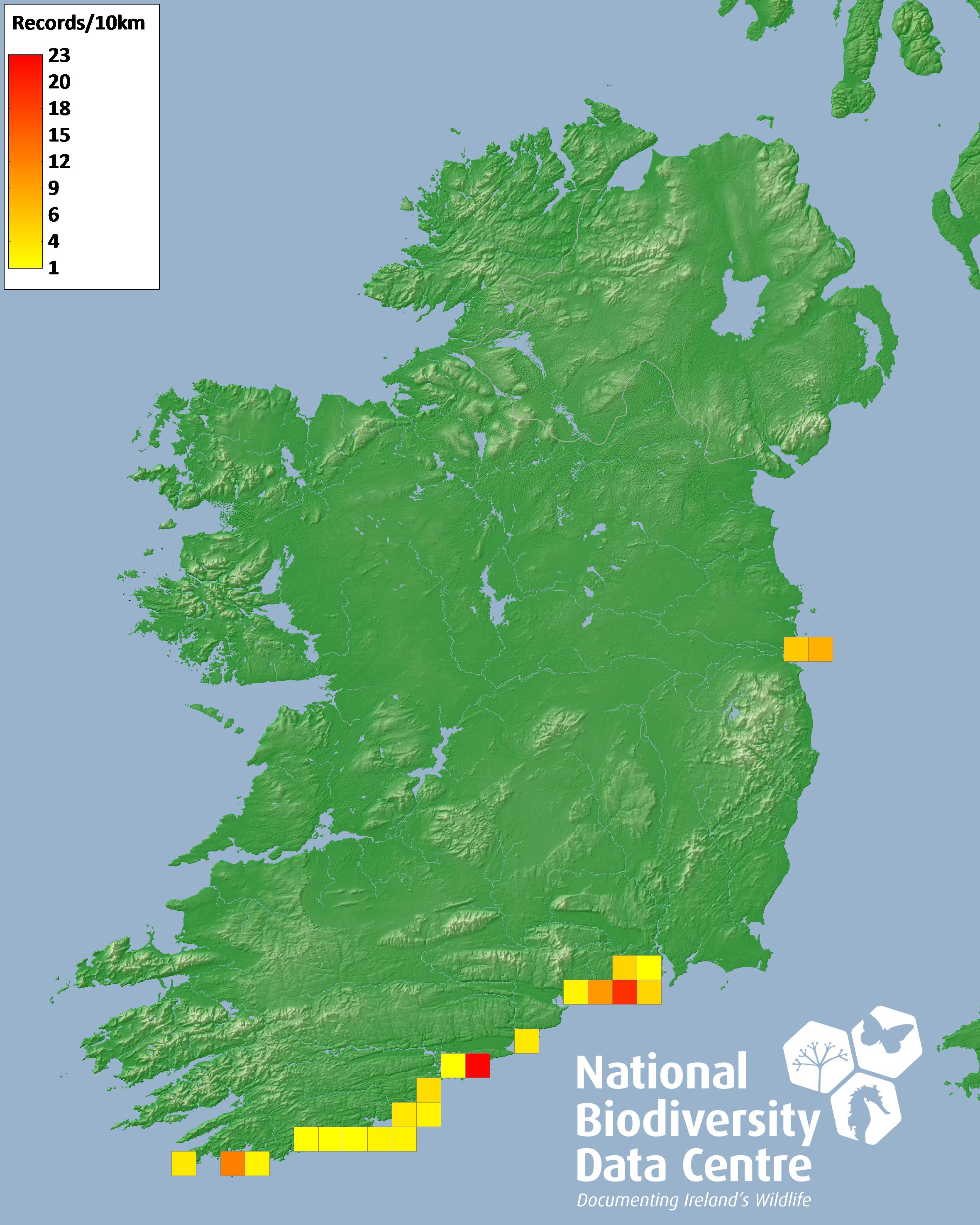 Distribution of the number of records recorded within each 10km grid square (ITM).Marine Map - 50km