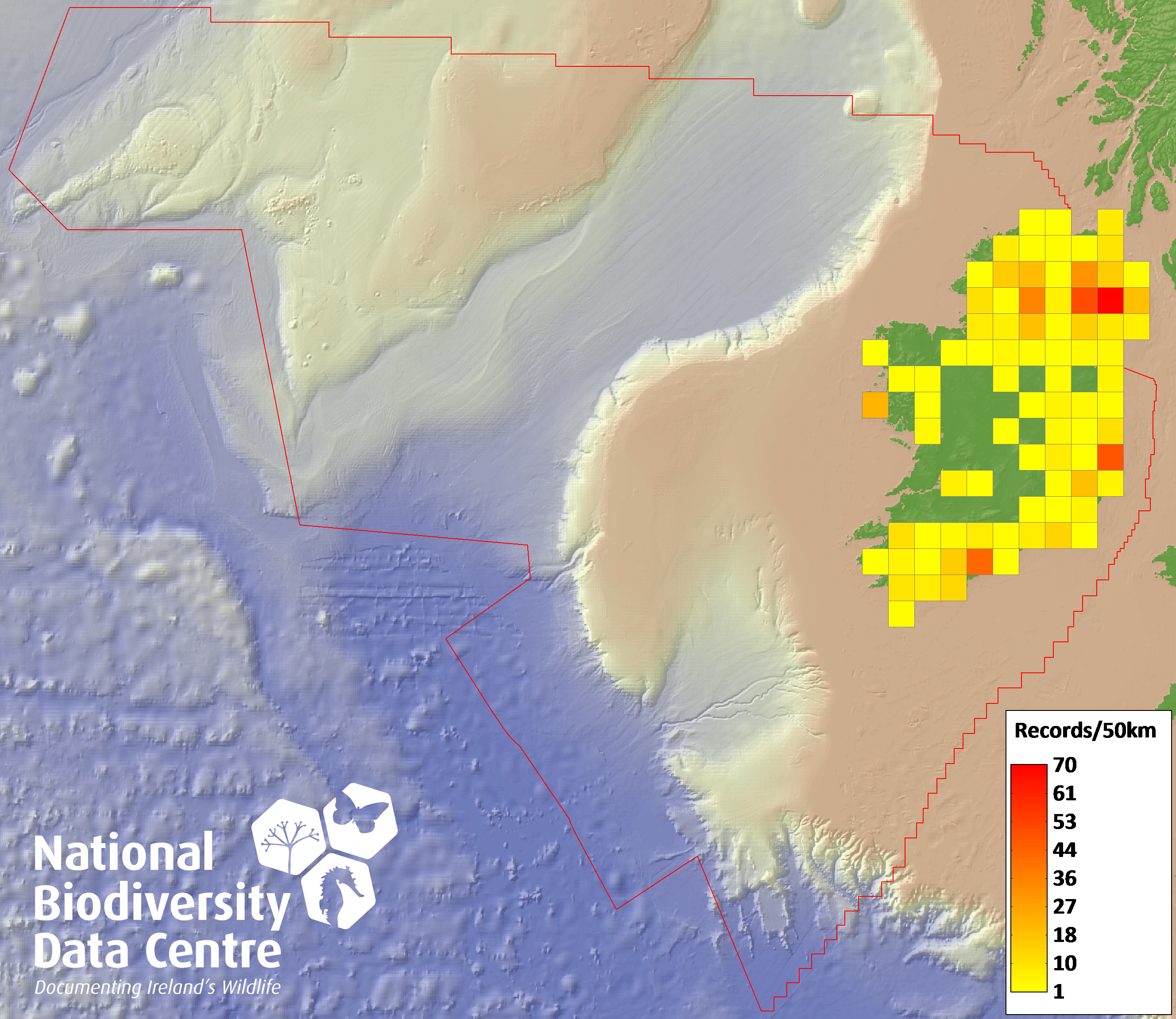 Distribution of the number of records recorded within each 10km grid square (ITM).Marine Map - 50km