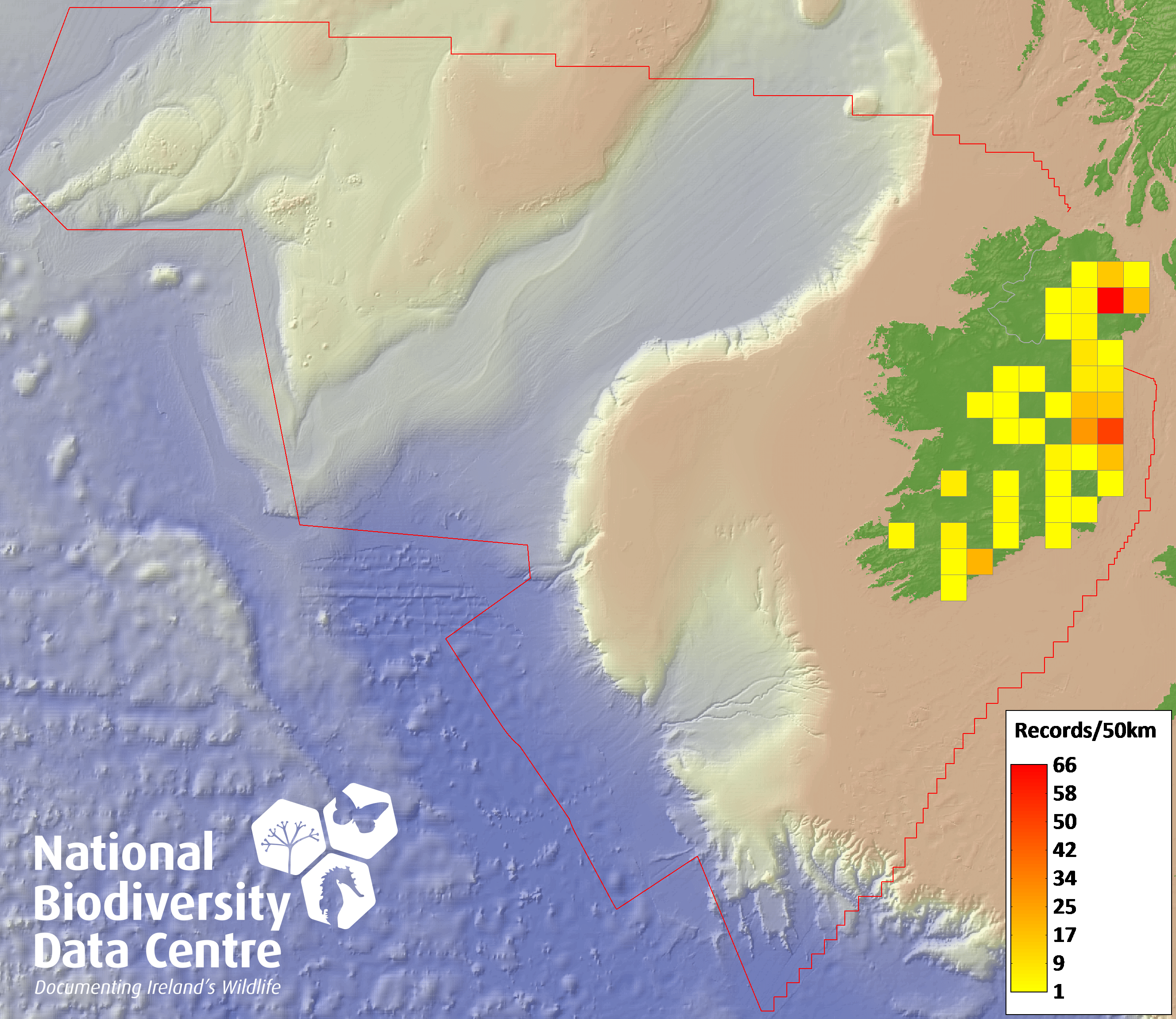 Distribution of the number of records recorded within each 10km grid square (ITM).Marine Map - 50km