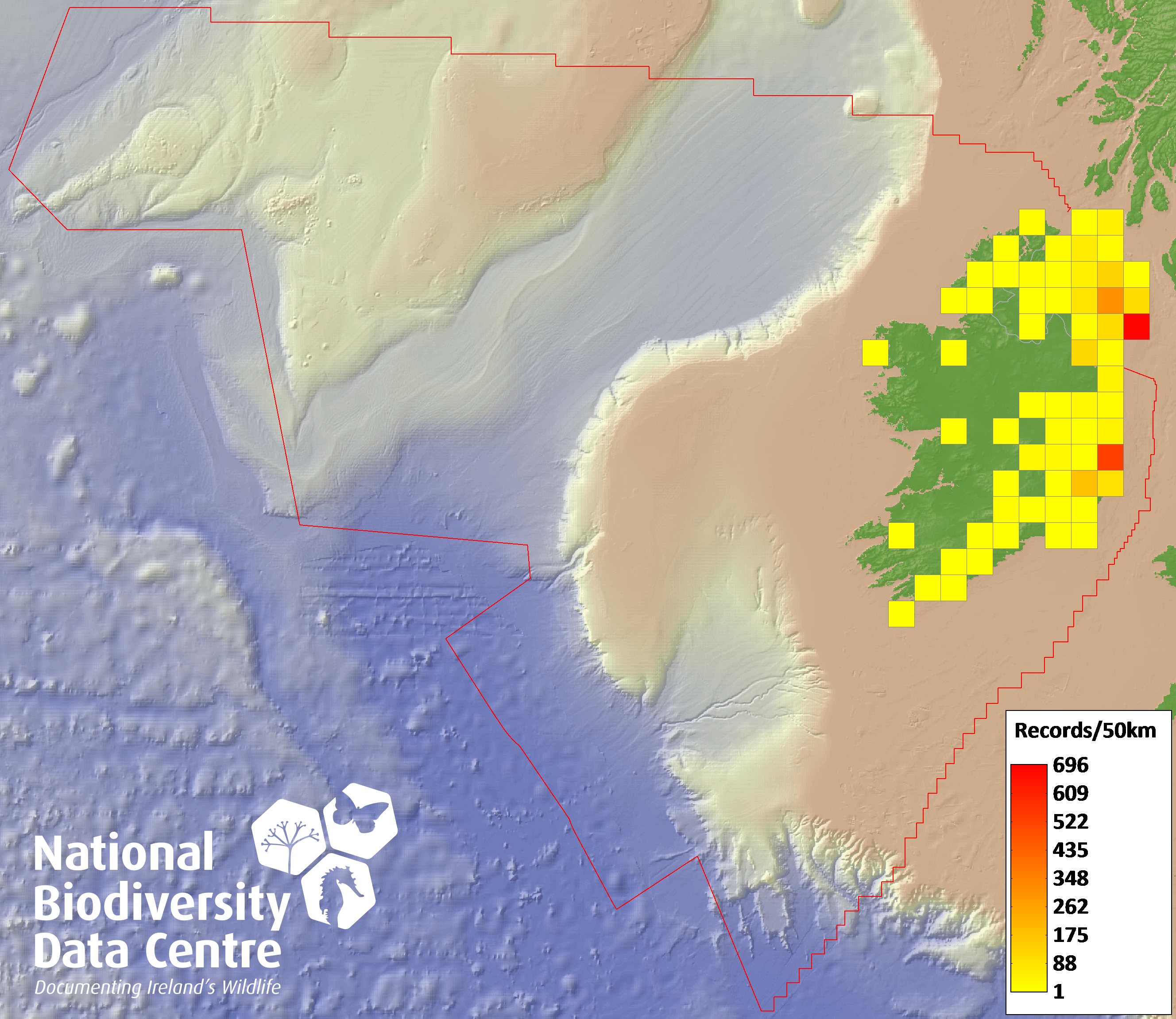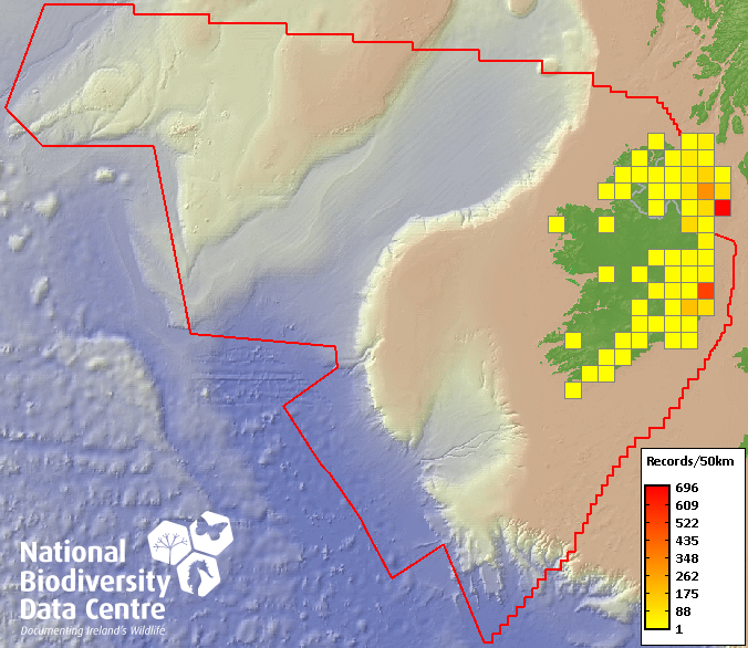 Distribution of the number of records recorded within each 10km grid square (ITM).Marine Map - 50km