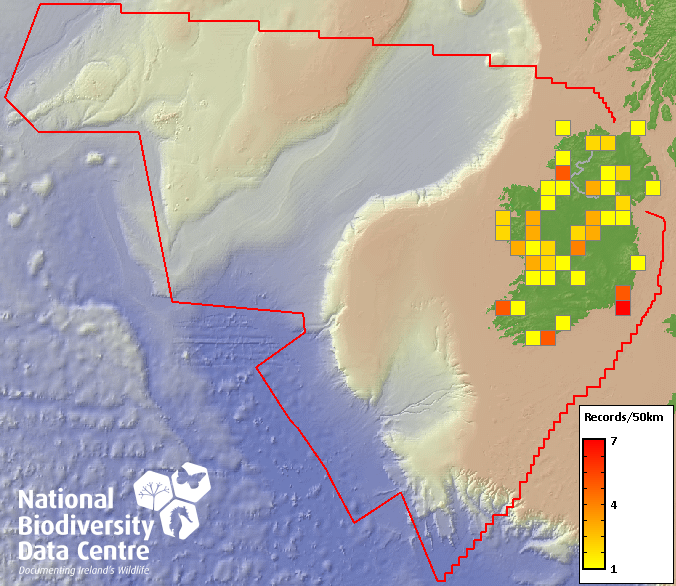 Distribution of the number of records recorded within each 10km grid square (ITM).Marine Map - 50km