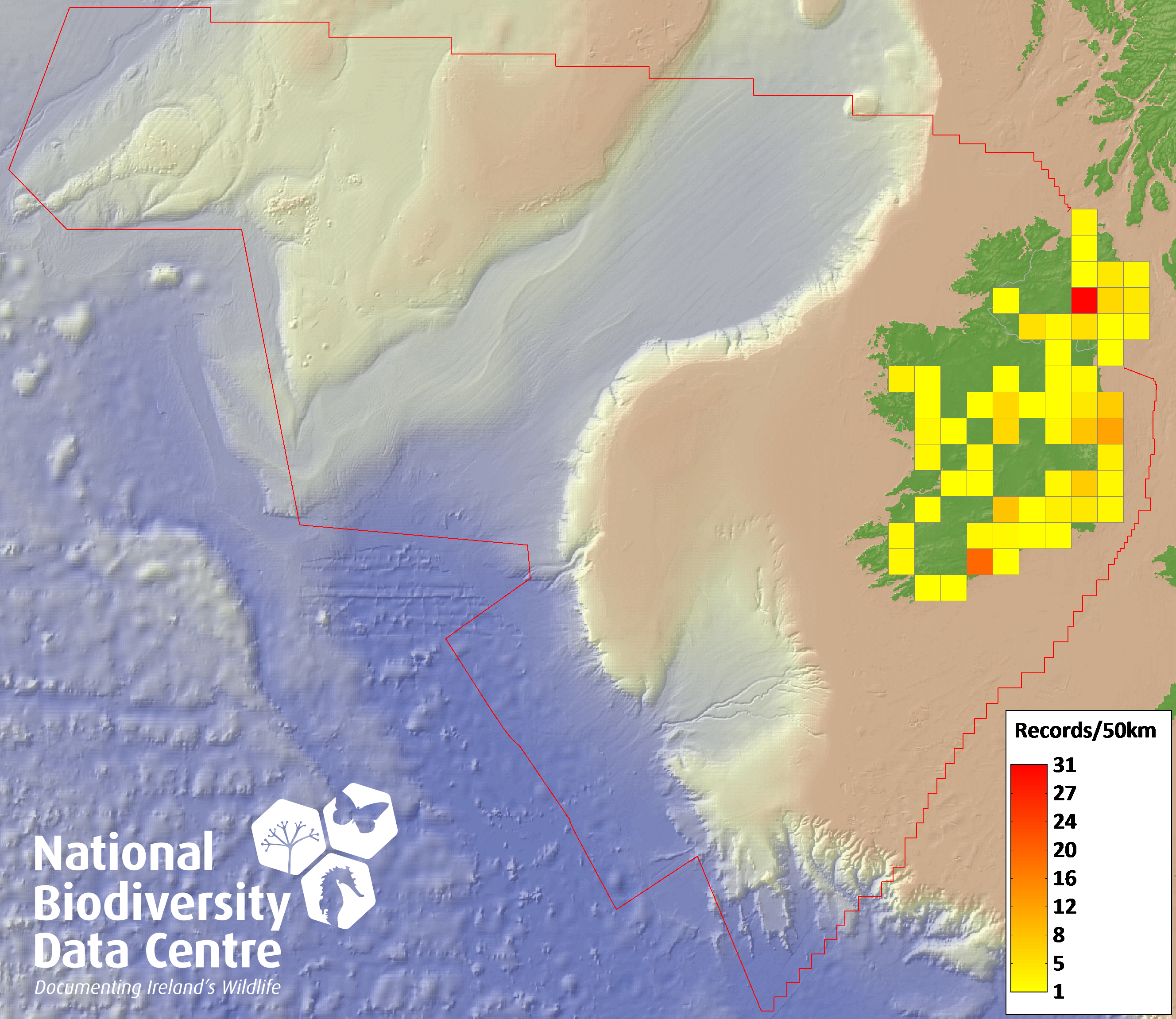Distribution of the number of records recorded within each 10km grid square (ITM).Marine Map - 50km