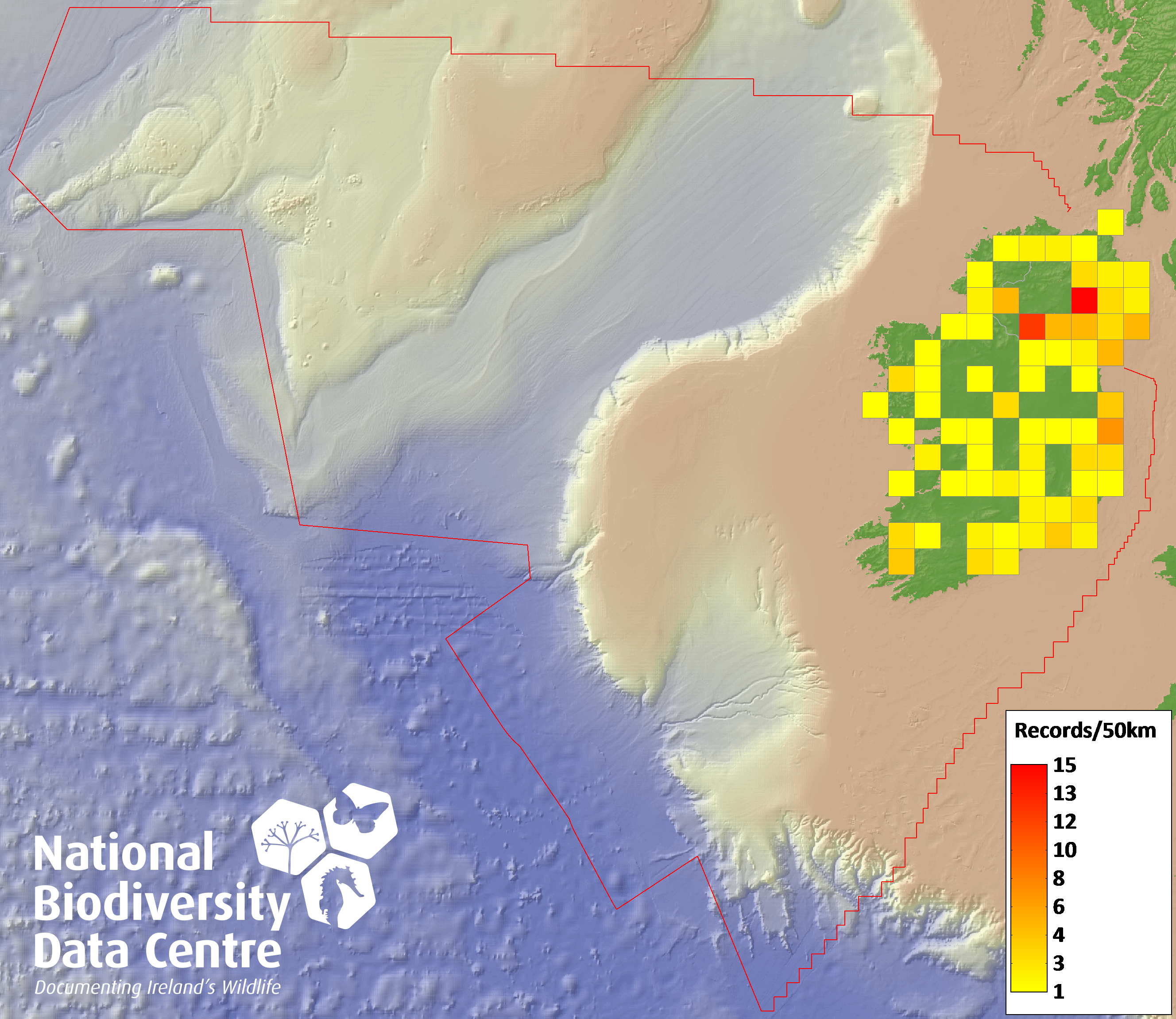 Distribution of the number of records recorded within each 10km grid square (ITM).Marine Map - 50km