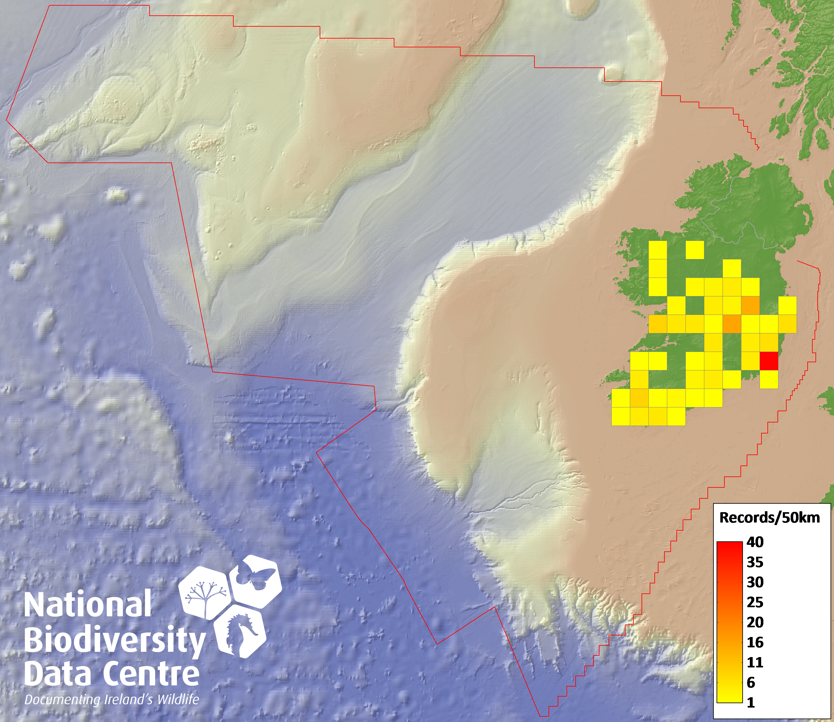Distribution of the number of records recorded within each 10km grid square (ITM).Marine Map - 50km