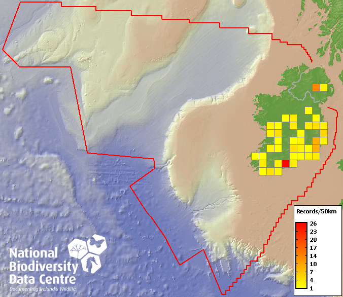 Distribution of the number of records recorded within each 10km grid square (ITM).Marine Map - 50km