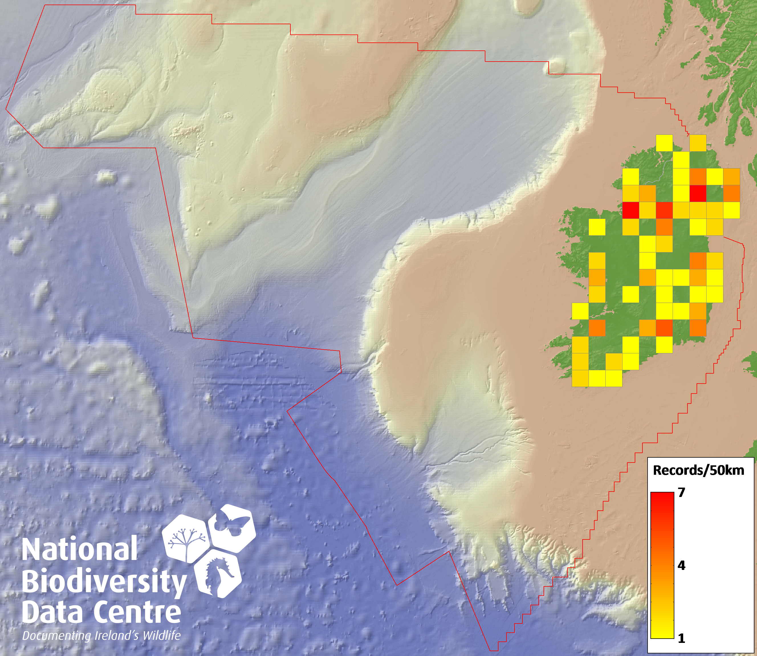 Distribution of the number of records recorded within each 10km grid square (ITM).Marine Map - 50km