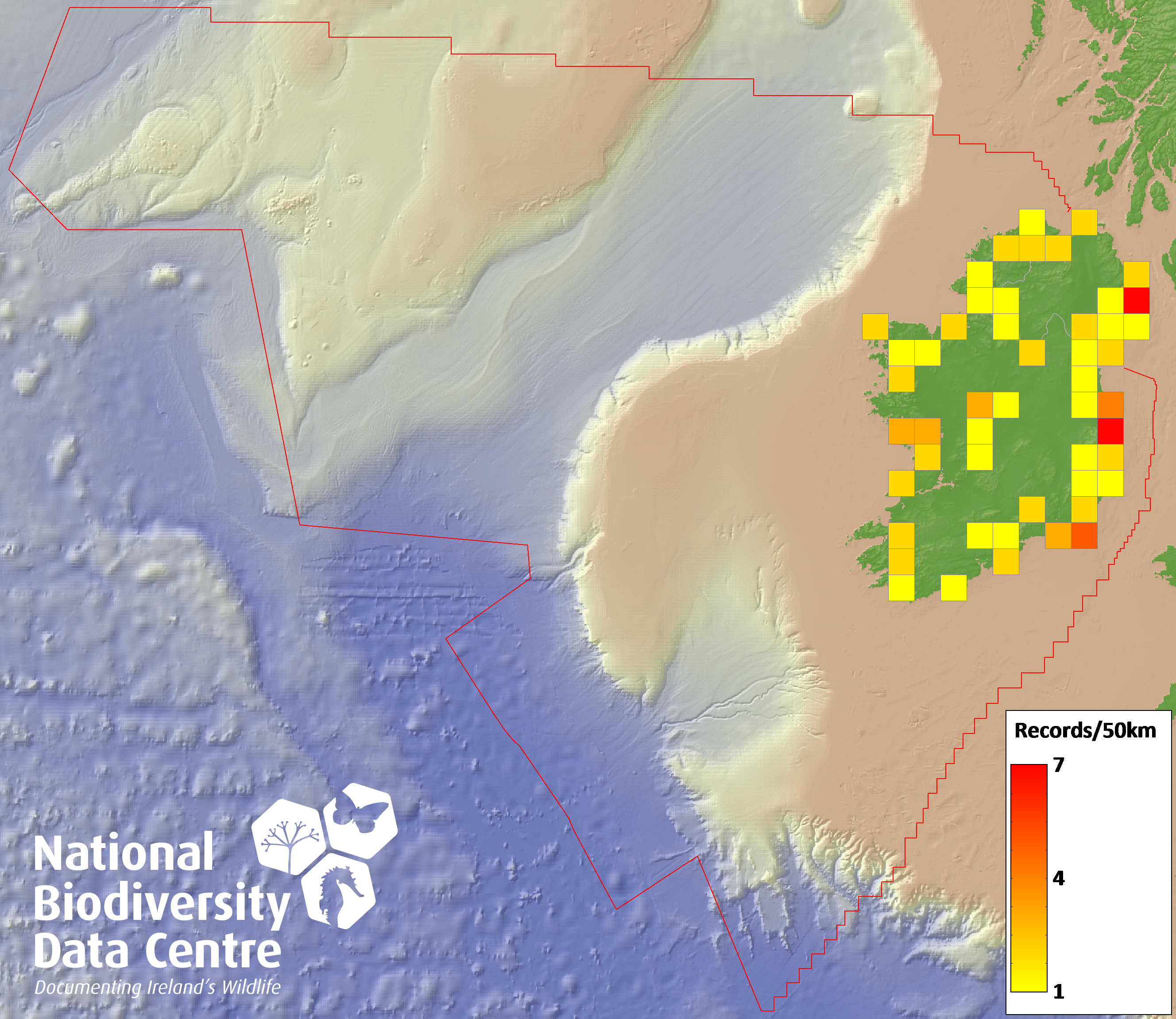 Distribution of the number of records recorded within each 10km grid square (ITM).Marine Map - 50km