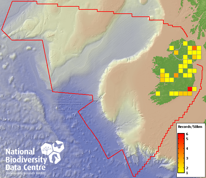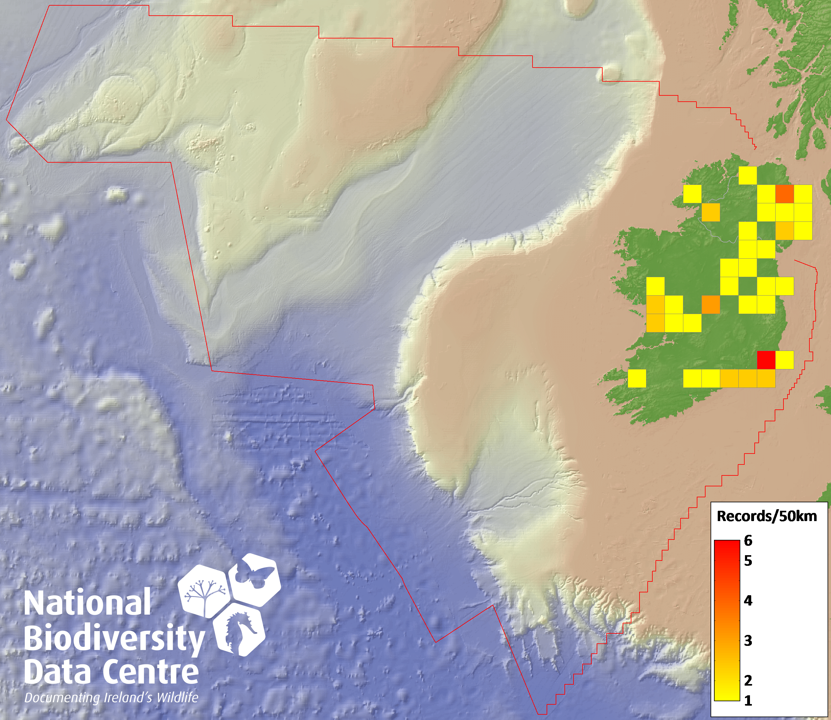 Distribution of the number of records recorded within each 10km grid square (ITM).Marine Map - 50km