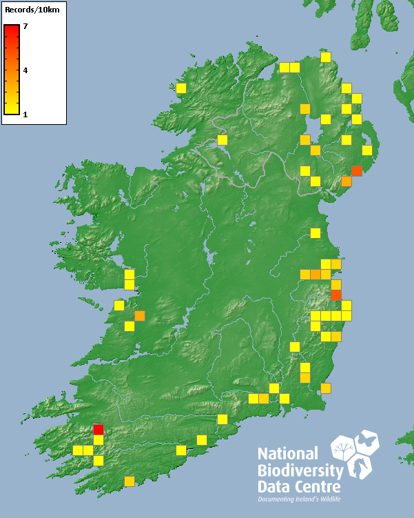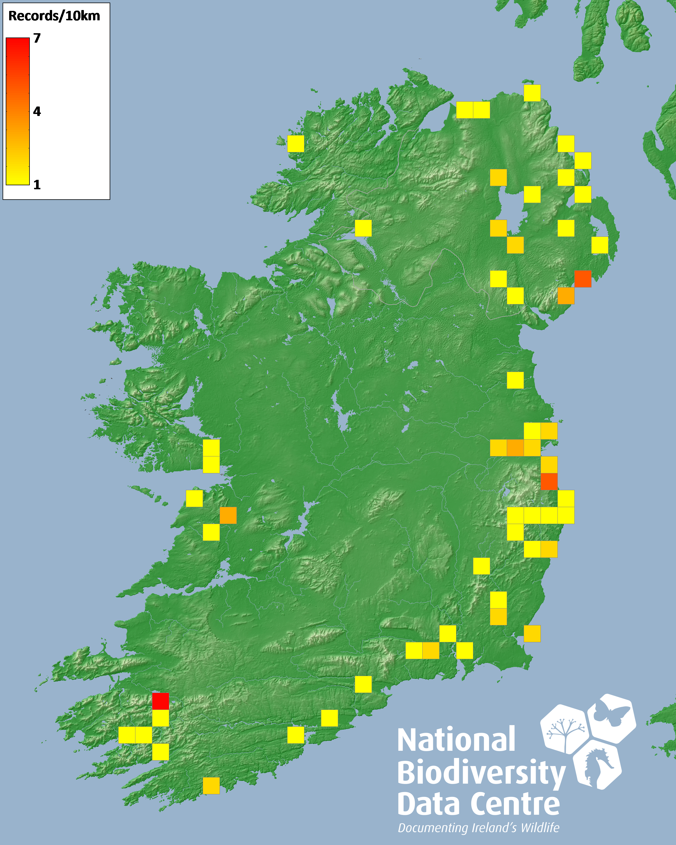 Distribution of the number of records recorded within each 10km grid square (ITM).Marine Map - 50km