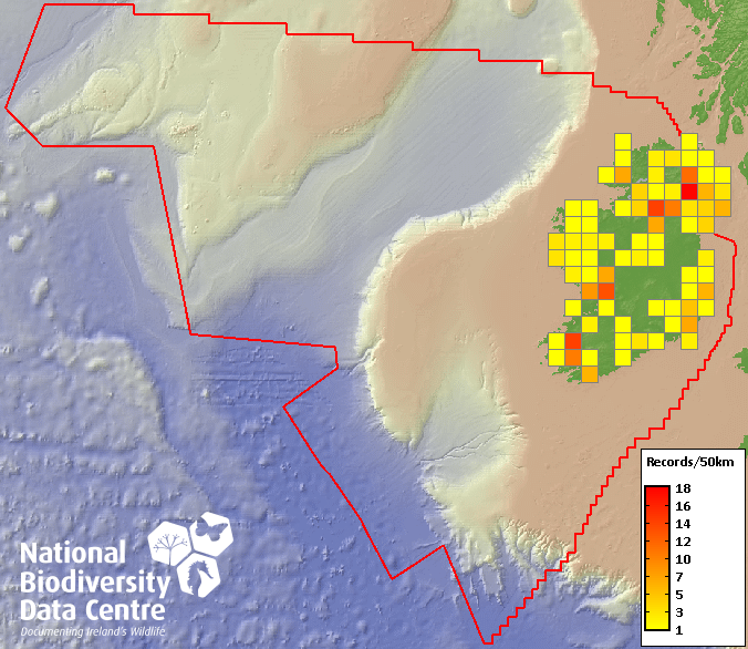 Distribution of the number of records recorded within each 10km grid square (ITM).Marine Map - 50km