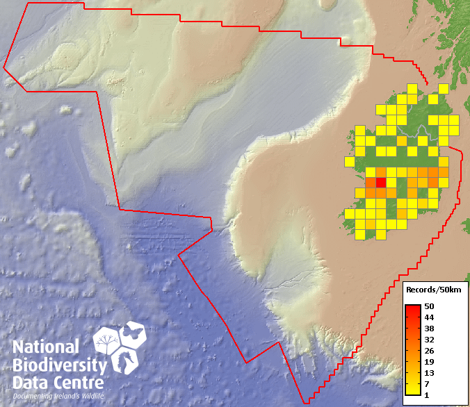 Distribution of the number of records recorded within each 10km grid square (ITM).Marine Map - 50km