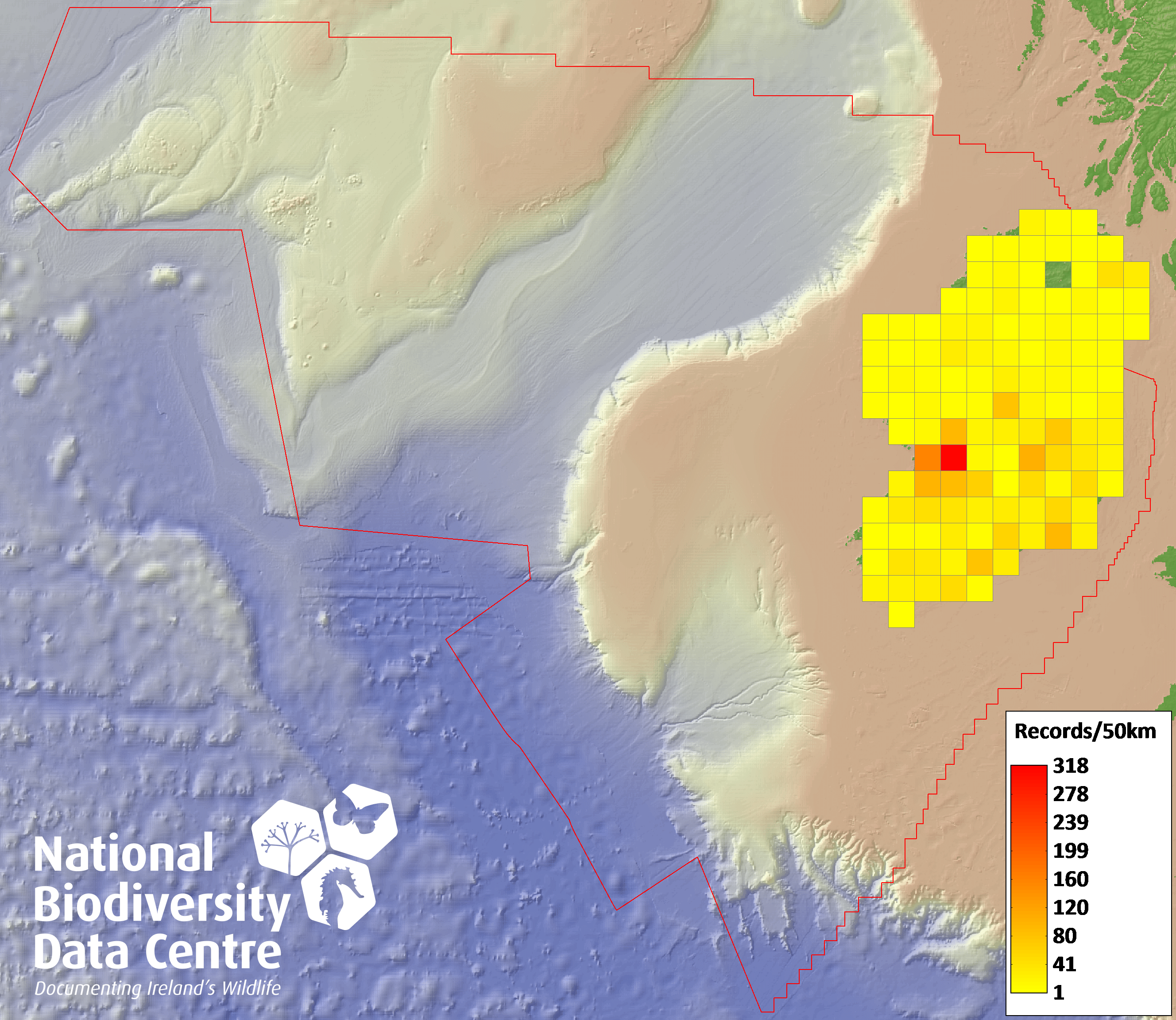Distribution of the number of records recorded within each 10km grid square (ITM).Marine Map - 50km
