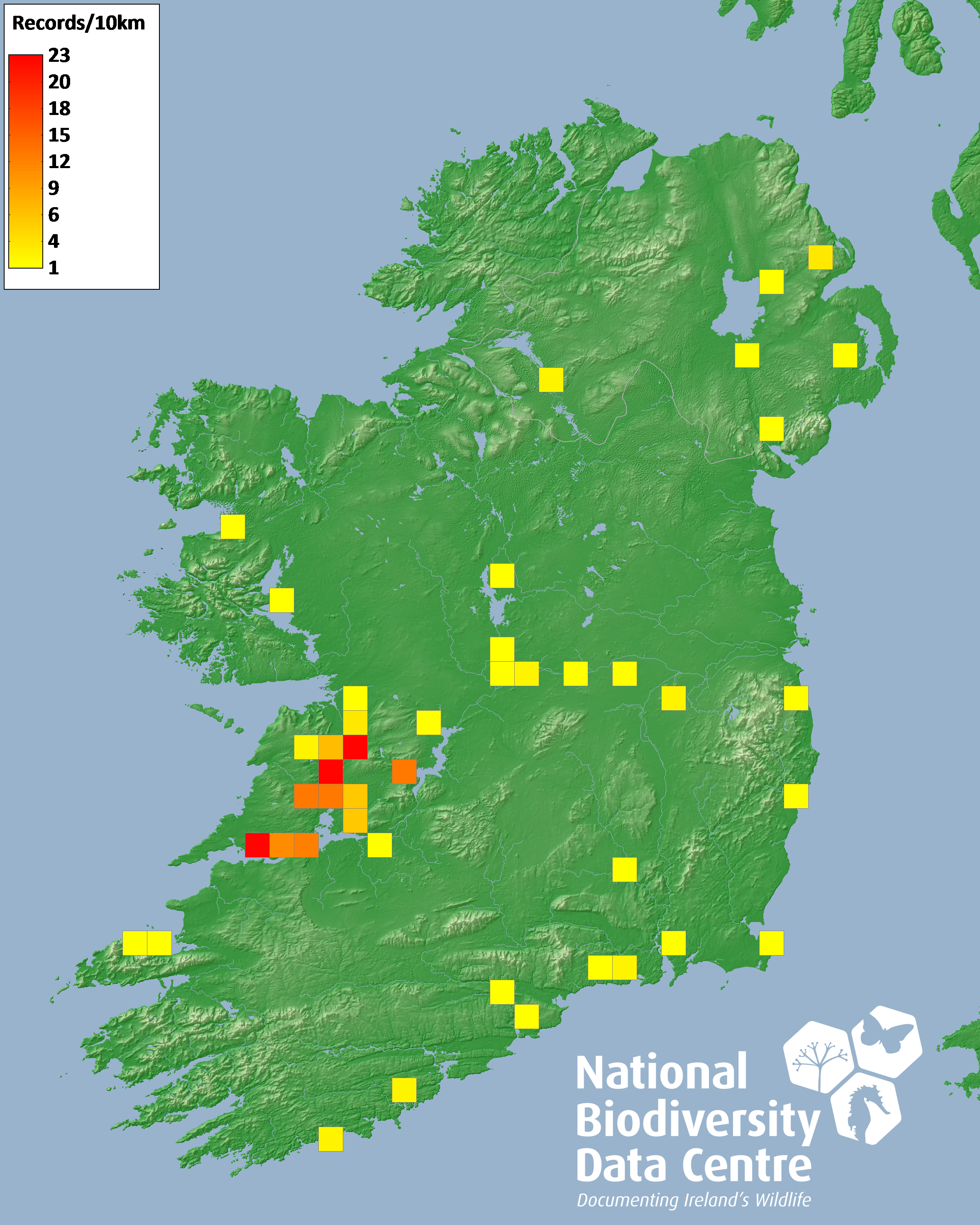 Distribution of the number of records recorded within each 10km grid square (ITM).Marine Map - 50km