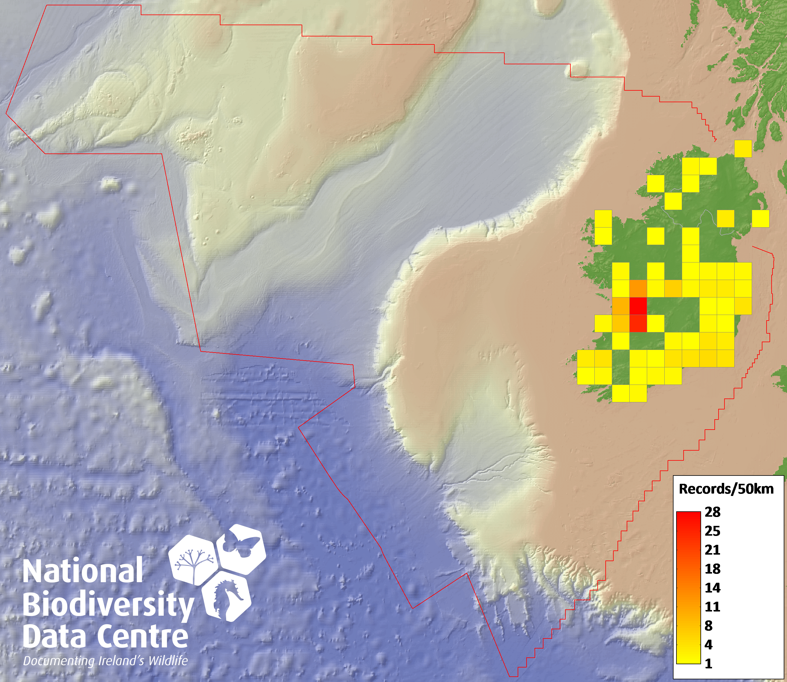 Distribution of the number of records recorded within each 10km grid square (ITM).Marine Map - 50km
