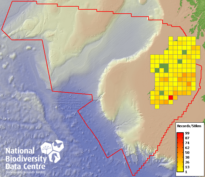 Distribution of the number of records recorded within each 10km grid square (ITM).Marine Map - 50km