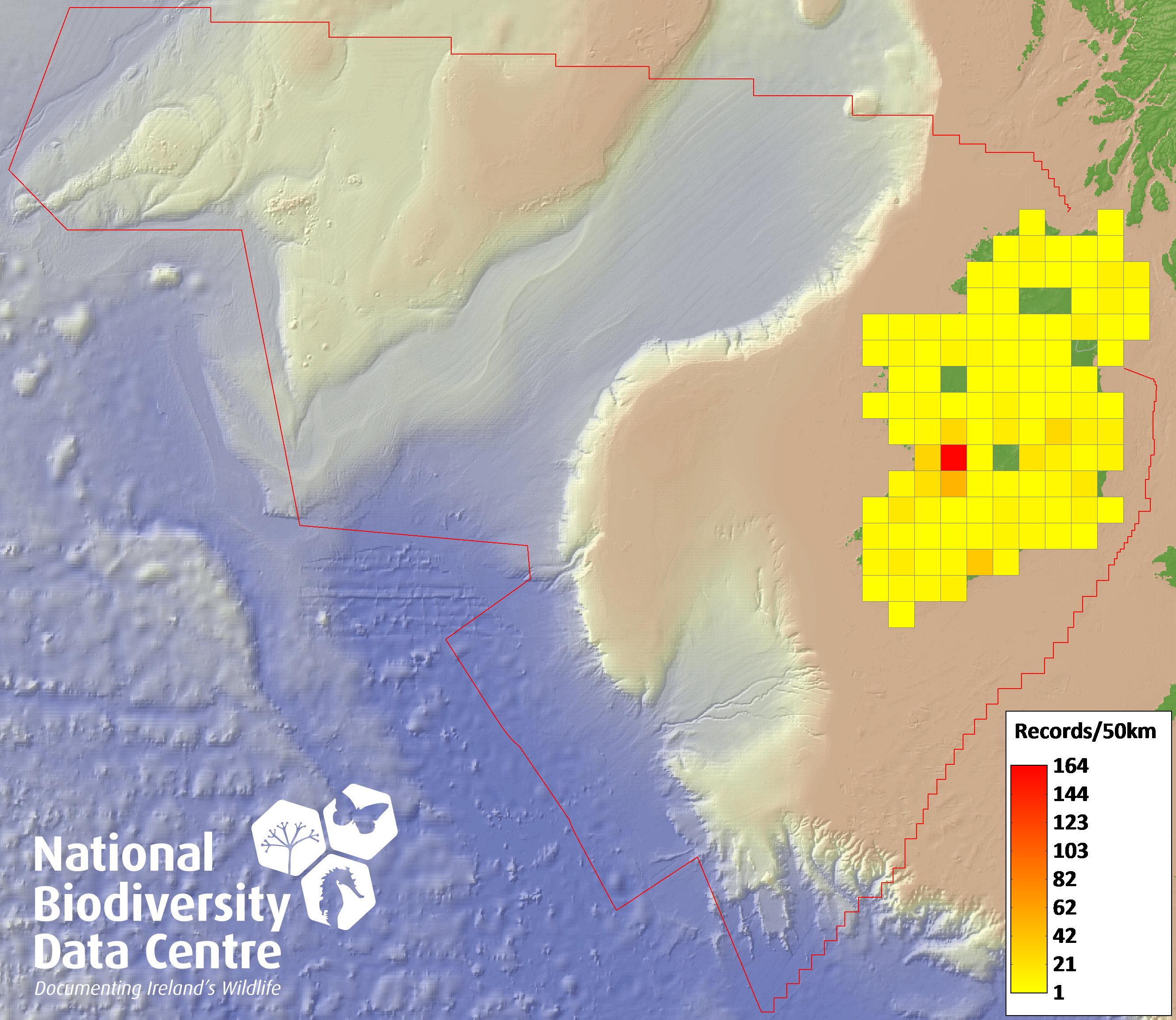 Distribution of the number of records recorded within each 10km grid square (ITM).Marine Map - 50km