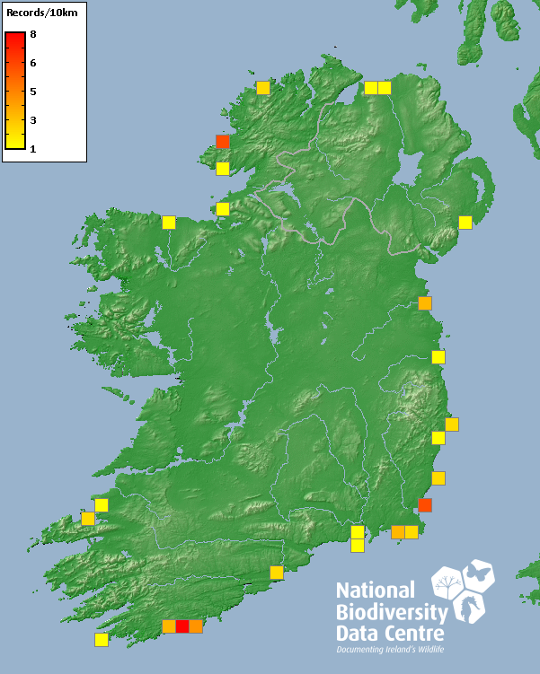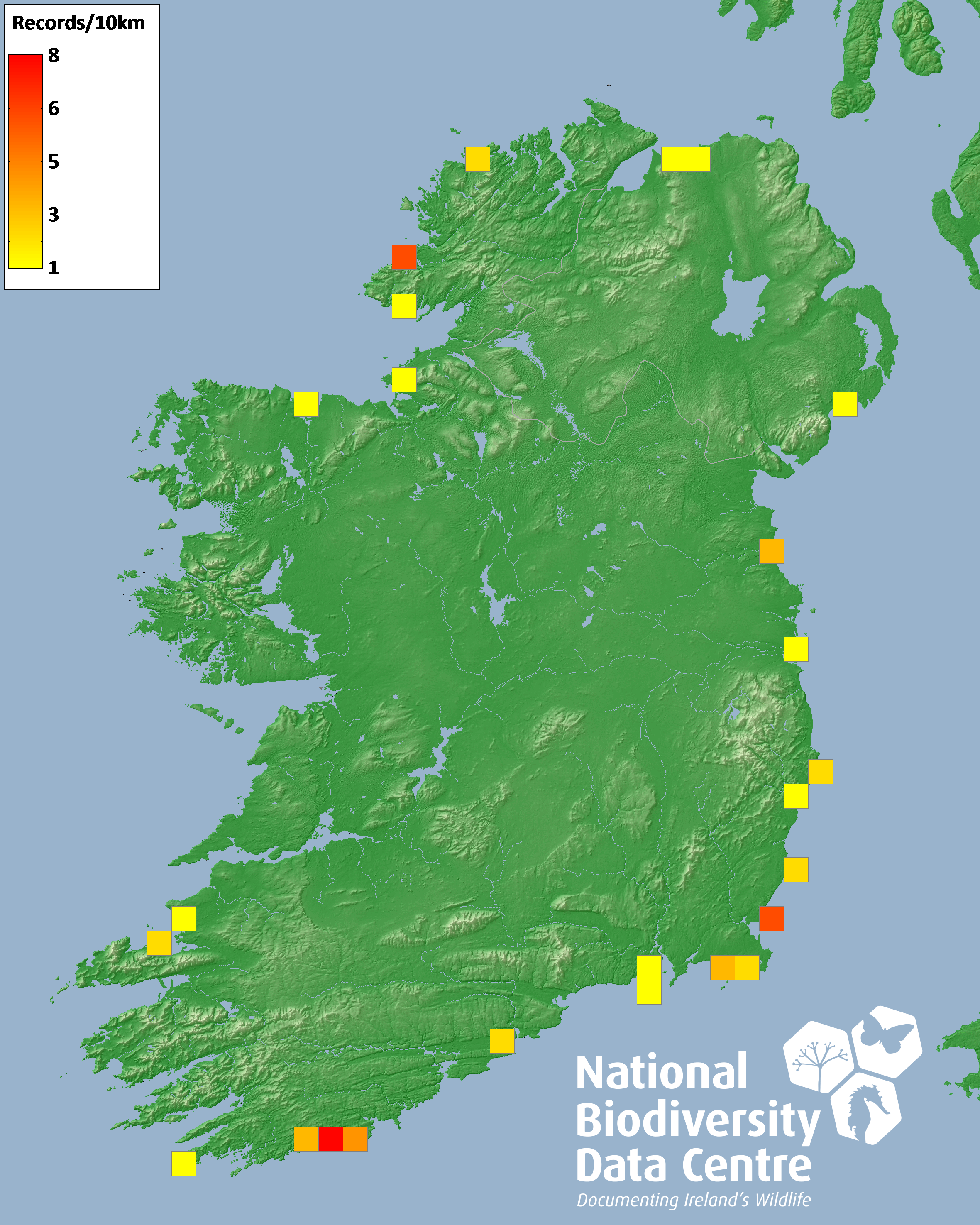 Distribution of the number of records recorded within each 10km grid square (ITM).Marine Map - 50km