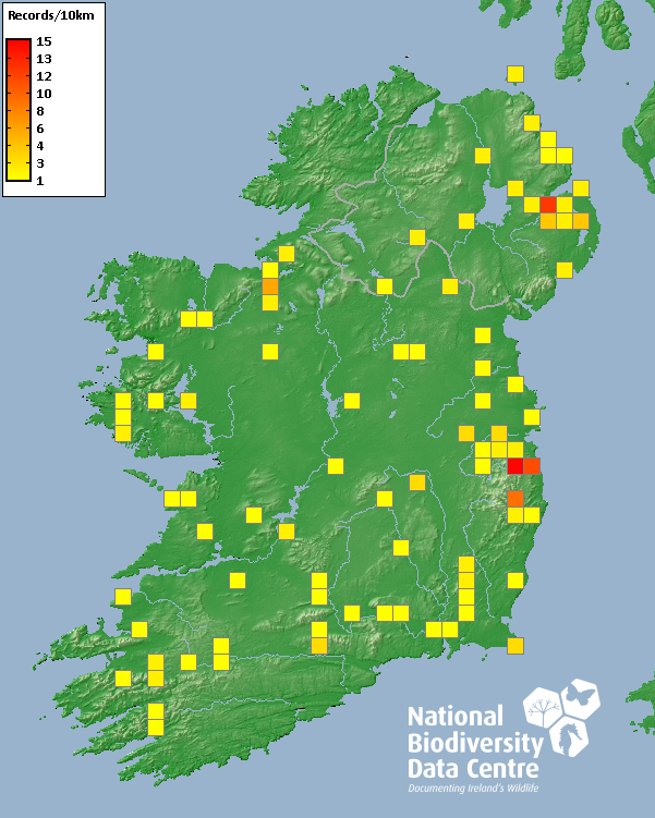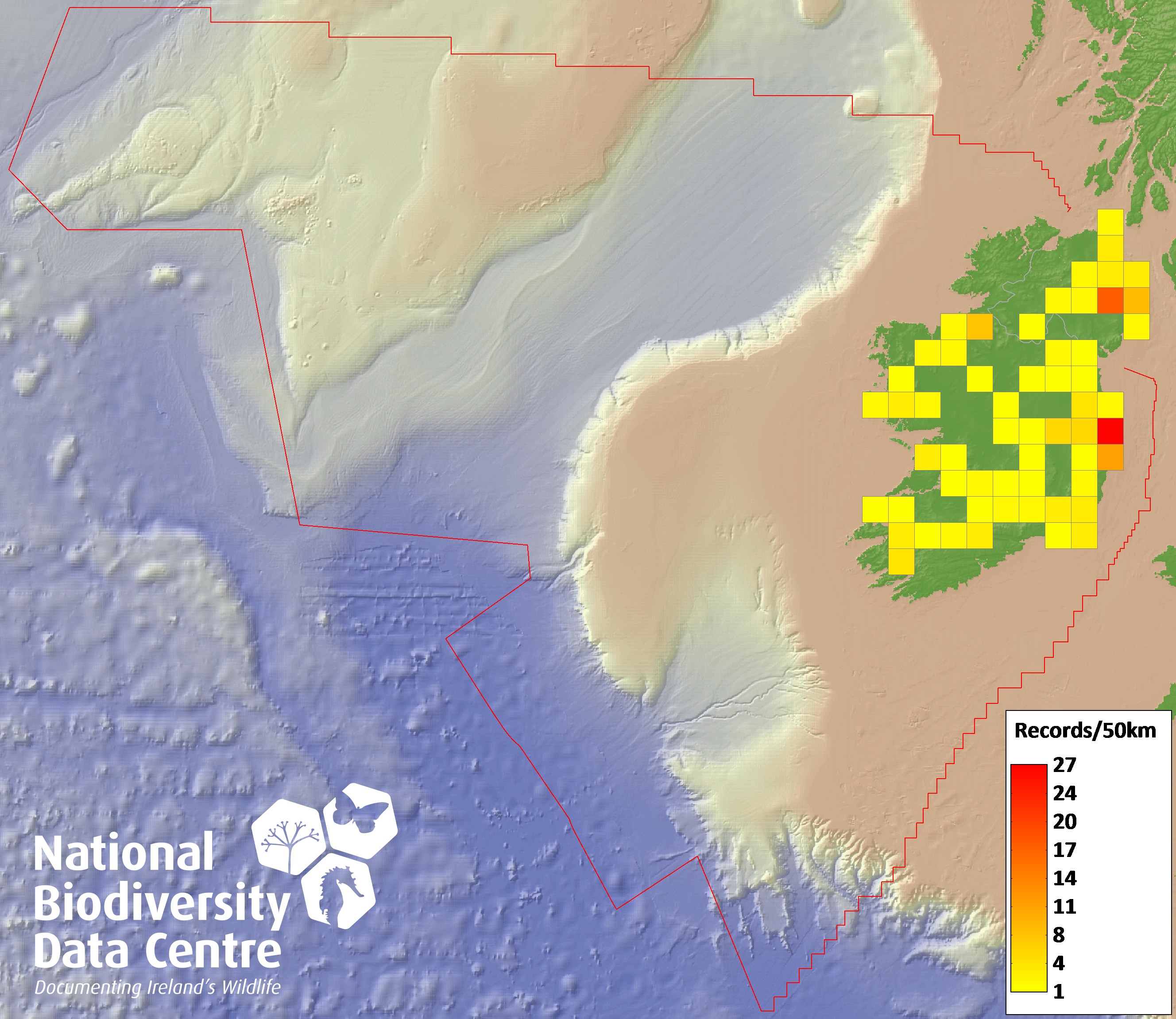 Distribution of the number of records recorded within each 10km grid square (ITM).Marine Map - 50km