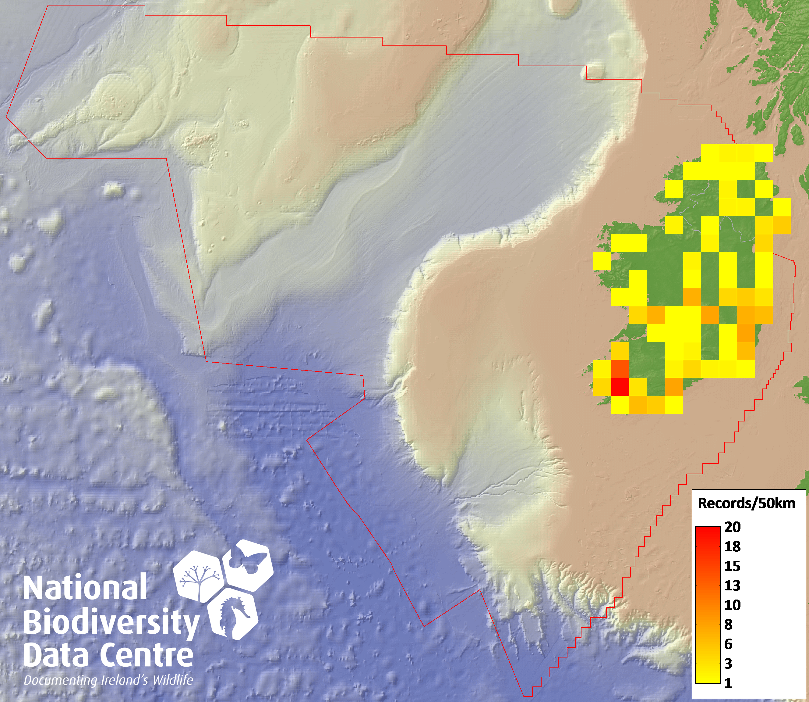Distribution of the number of records recorded within each 10km grid square (ITM).Marine Map - 50km