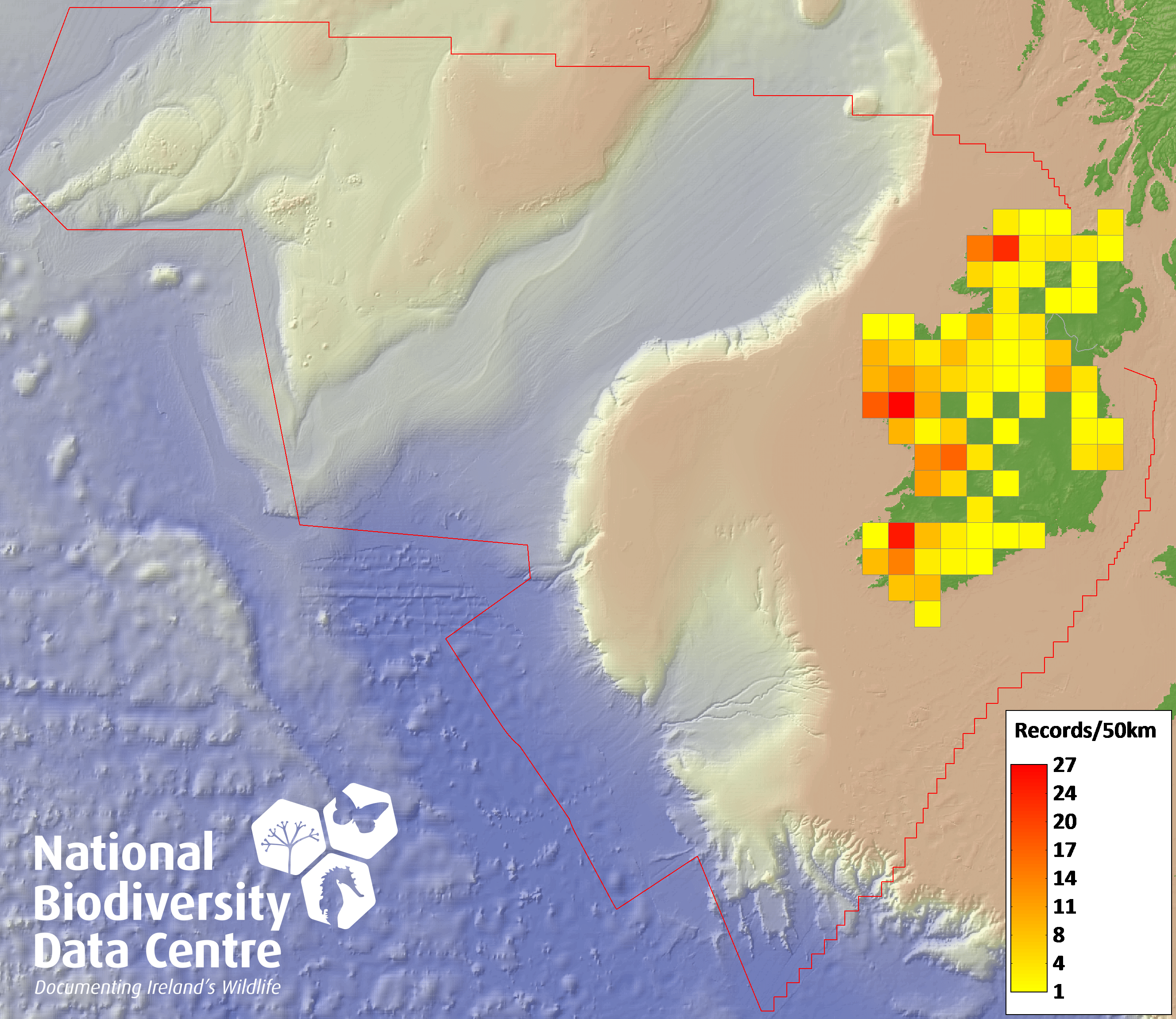 Distribution of the number of records recorded within each 10km grid square (ITM).Marine Map - 50km