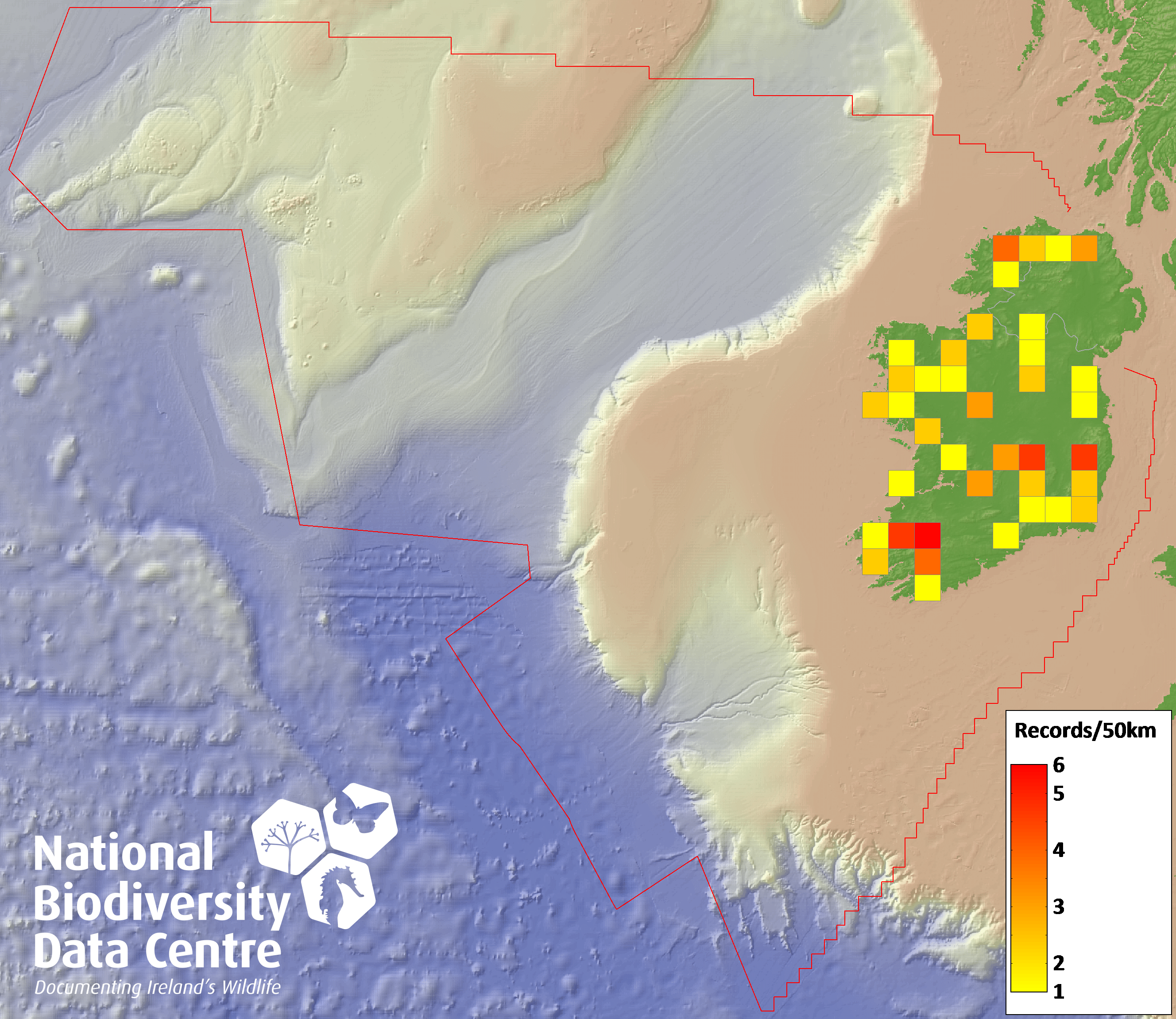Distribution of the number of records recorded within each 10km grid square (ITM).Marine Map - 50km