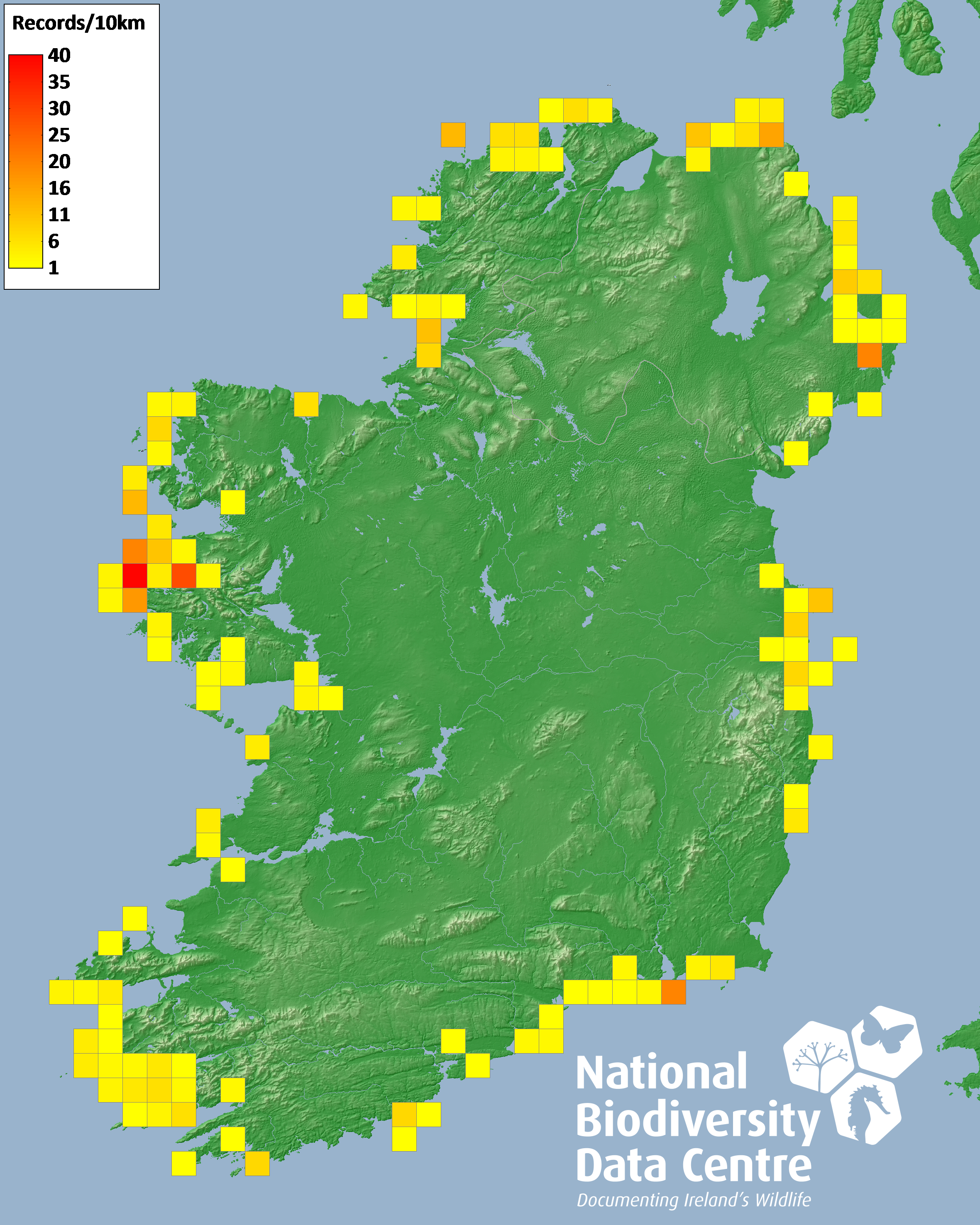Distribution of the number of records recorded within each 10km grid square (ITM).Marine Map - 50km