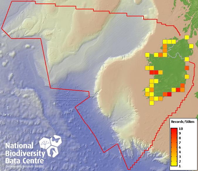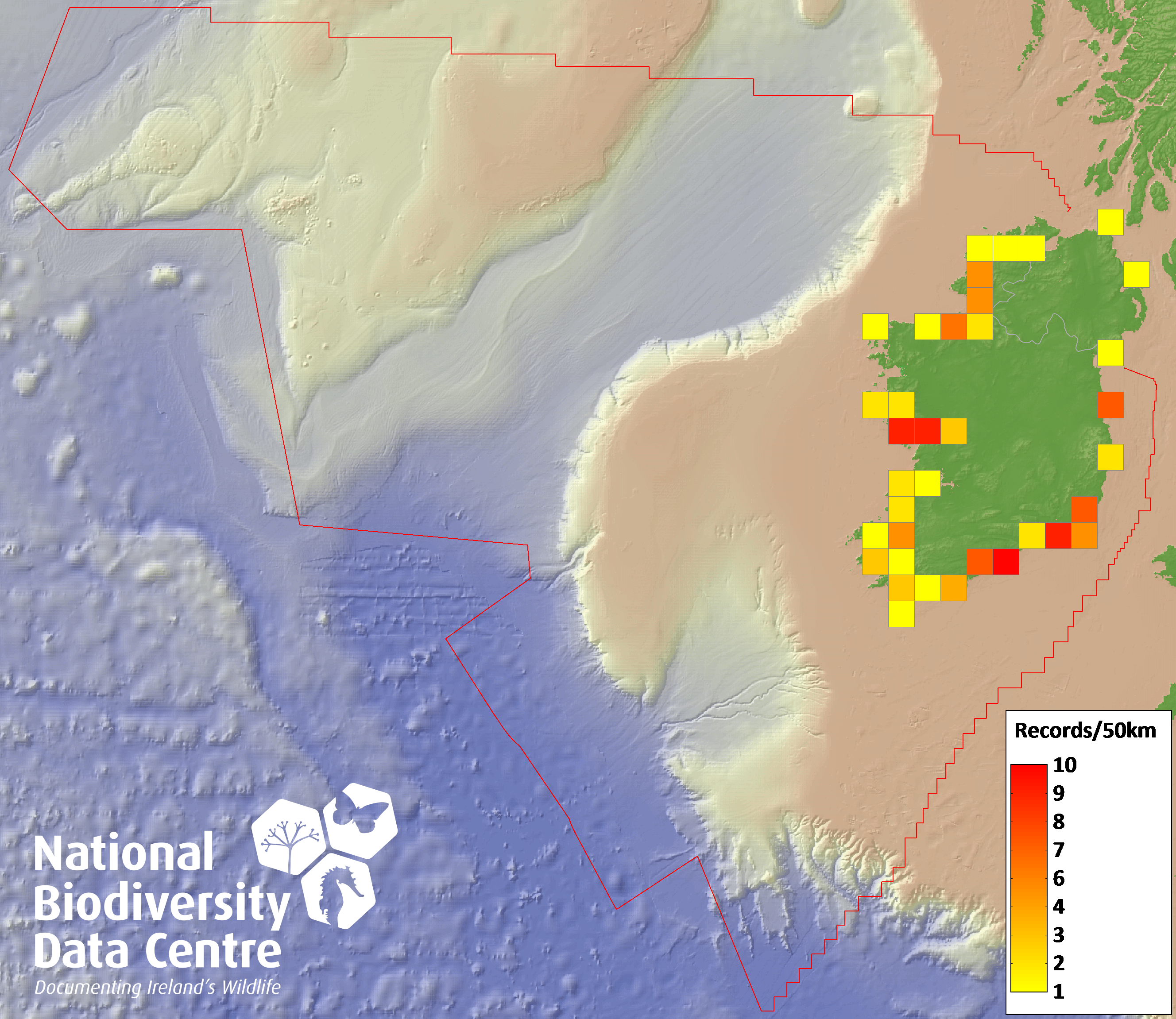 Distribution of the number of records recorded within each 10km grid square (ITM).Marine Map - 50km