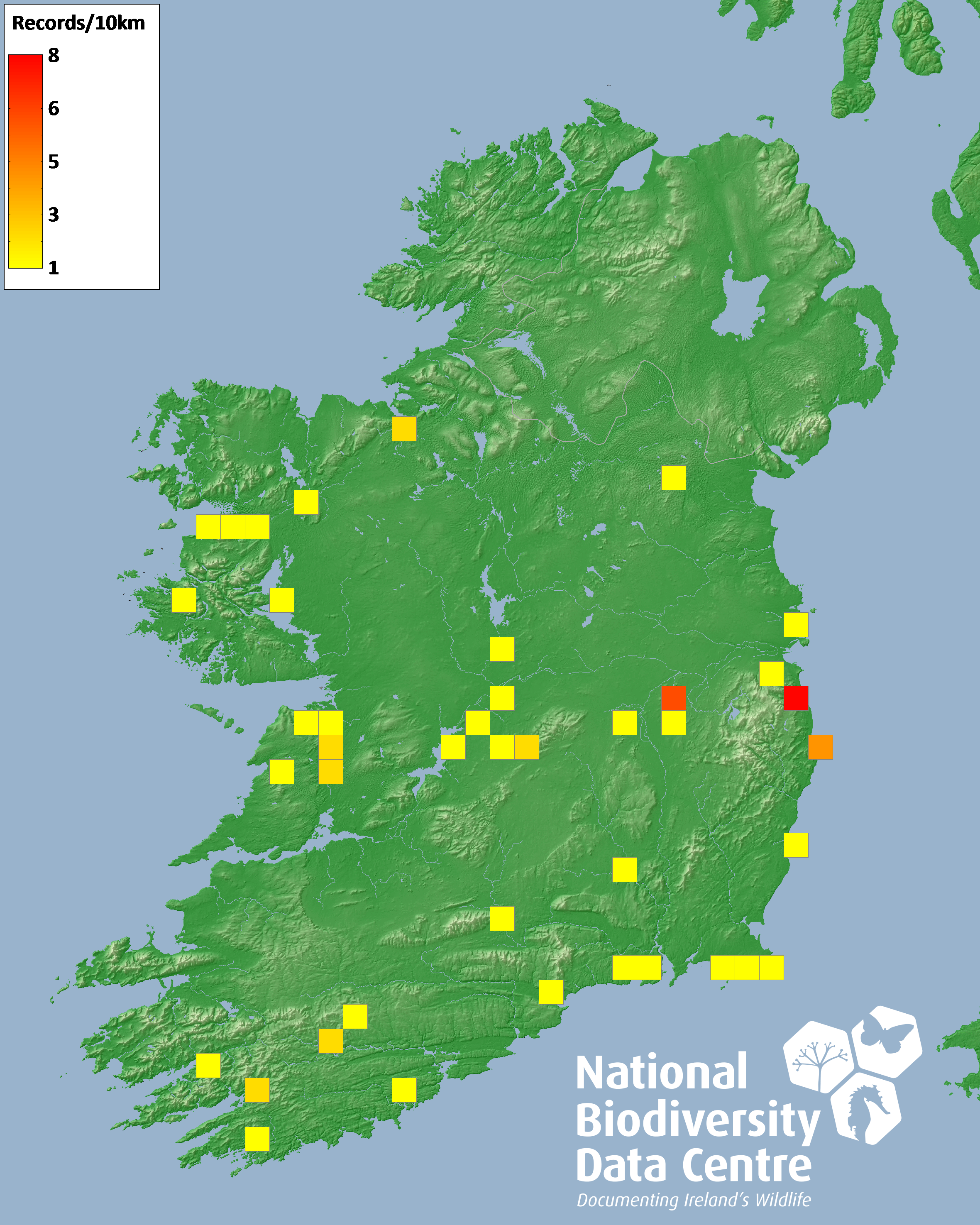 Distribution of the number of records recorded within each 10km grid square (ITM).Marine Map - 50km