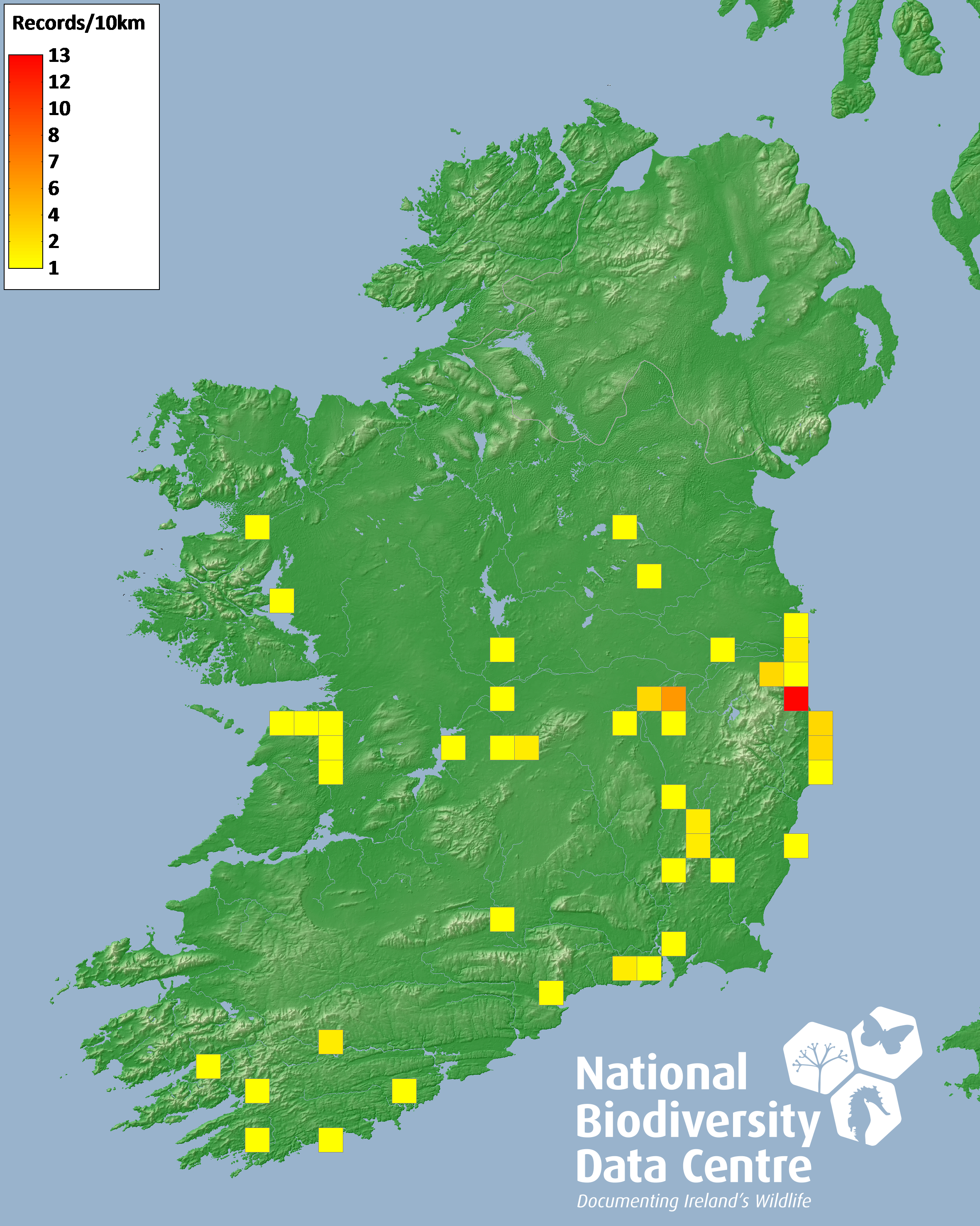Distribution of the number of records recorded within each 10km grid square (ITM).Marine Map - 50km