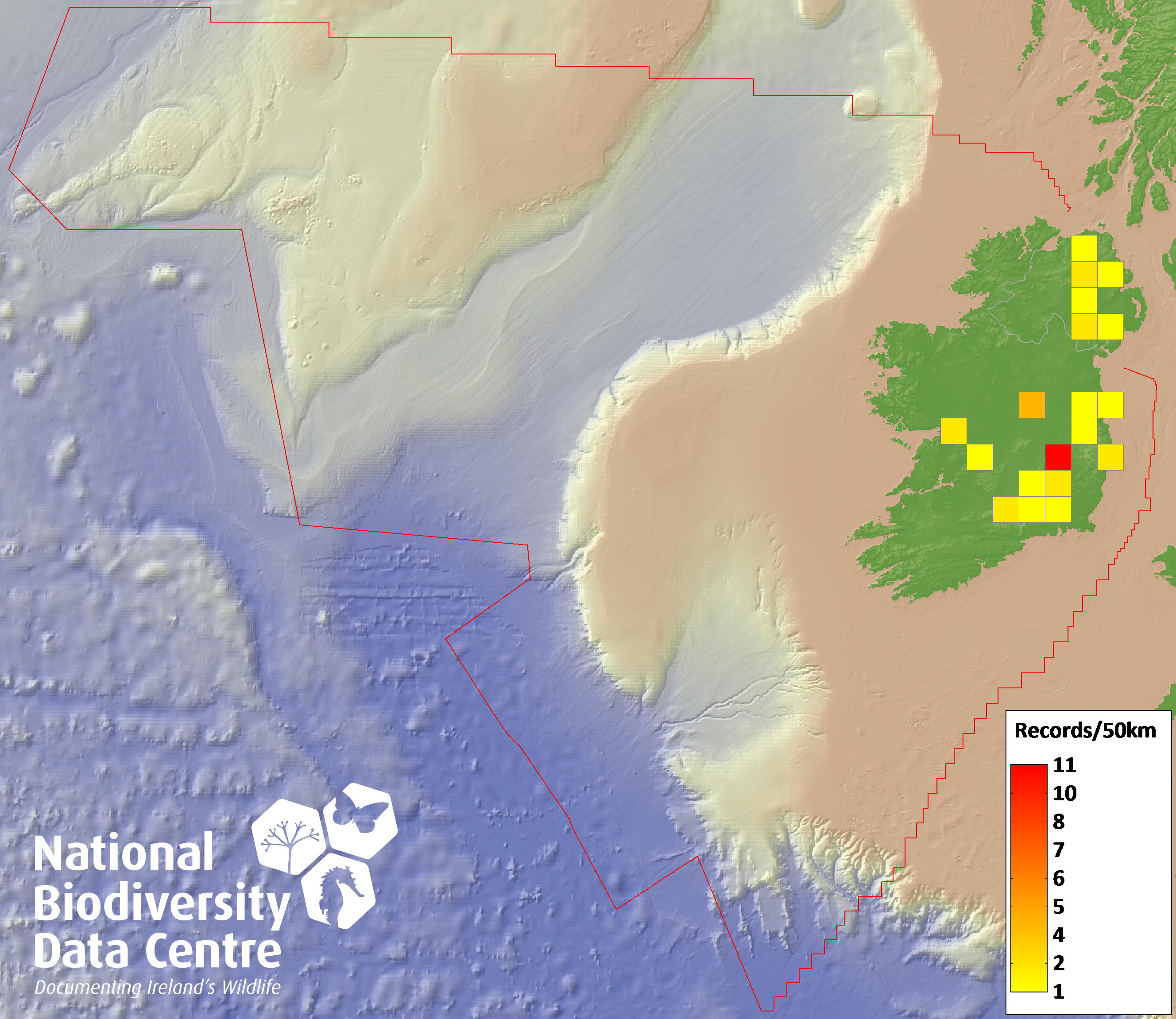 Distribution of the number of records recorded within each 10km grid square (ITM).Marine Map - 50km