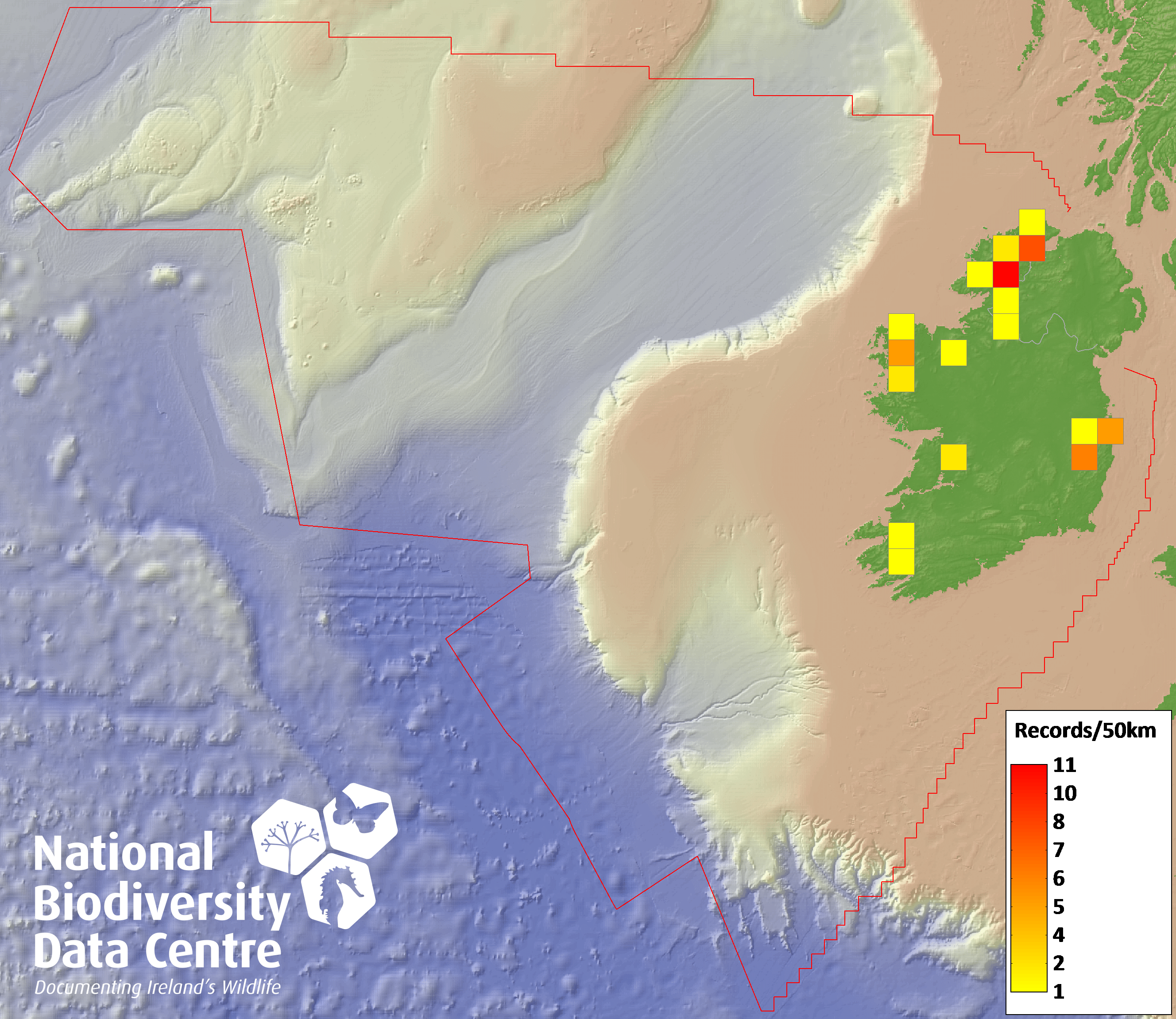 Distribution of the number of records recorded within each 10km grid square (ITM).Marine Map - 50km