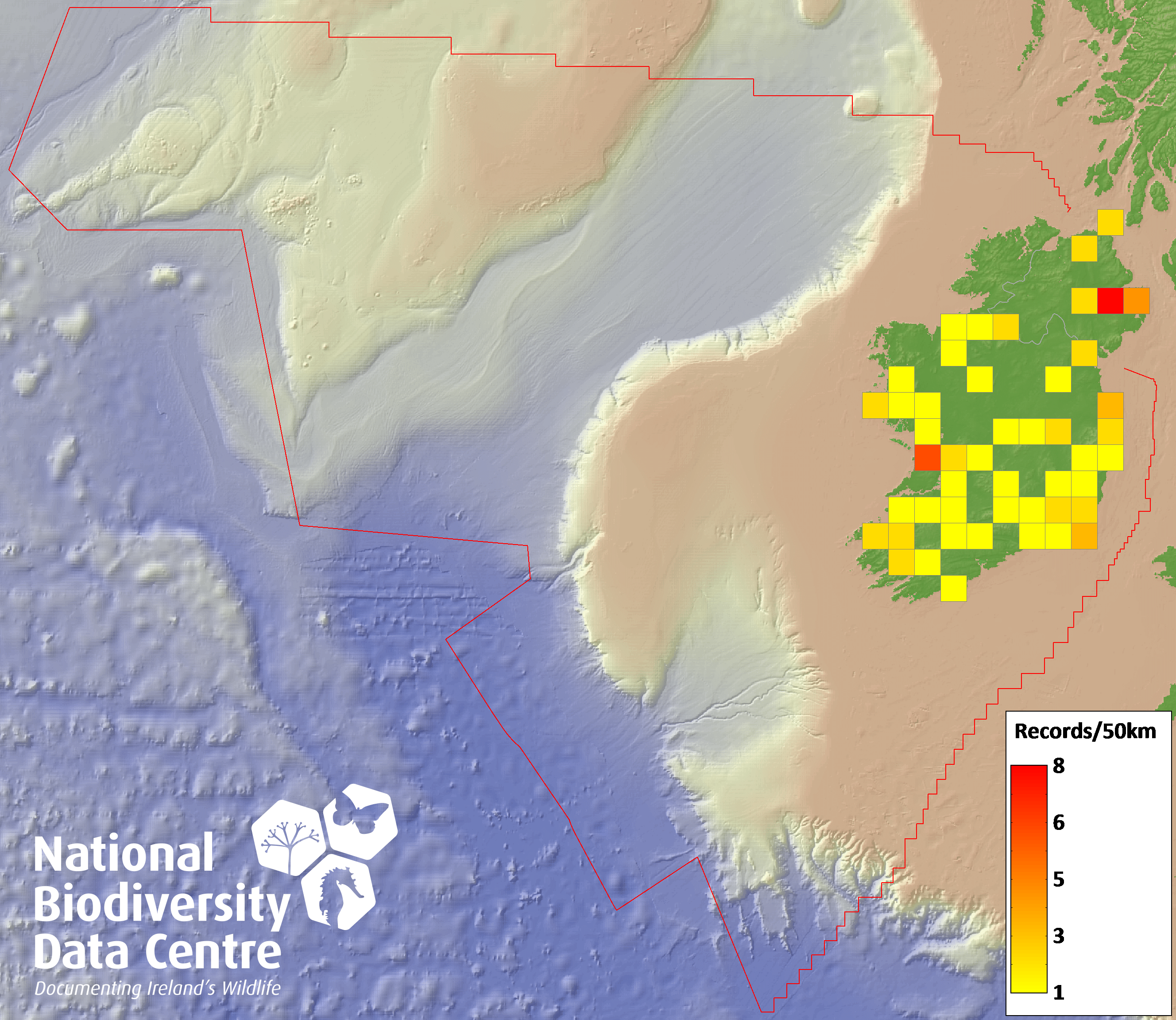 Distribution of the number of records recorded within each 10km grid square (ITM).Marine Map - 50km