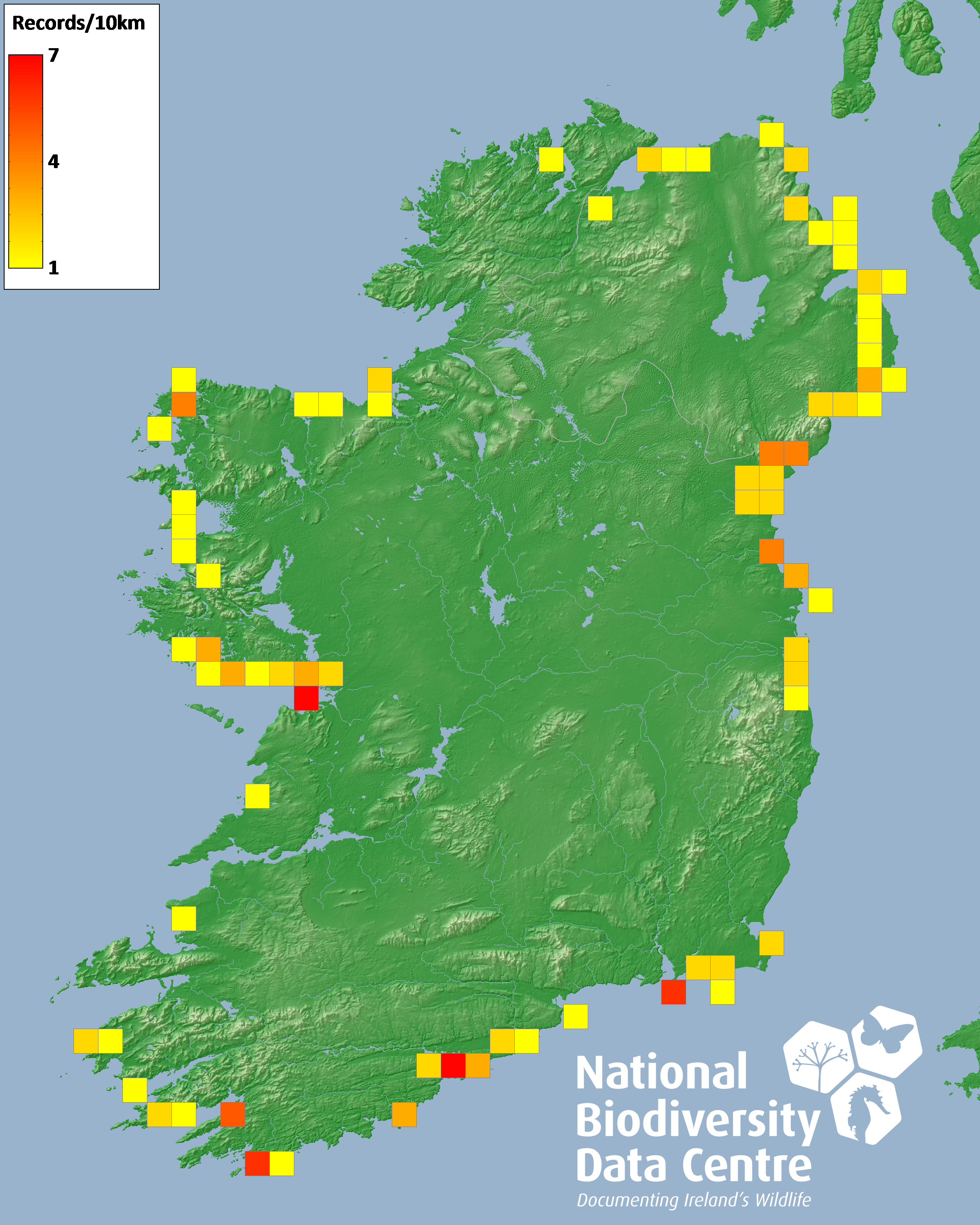 Distribution of the number of records recorded within each 10km grid square (ITM).Marine Map - 50km