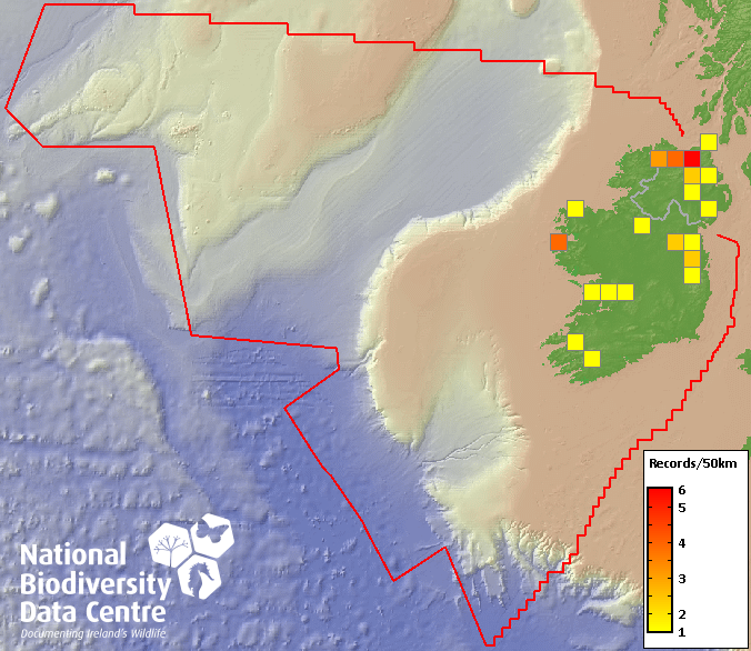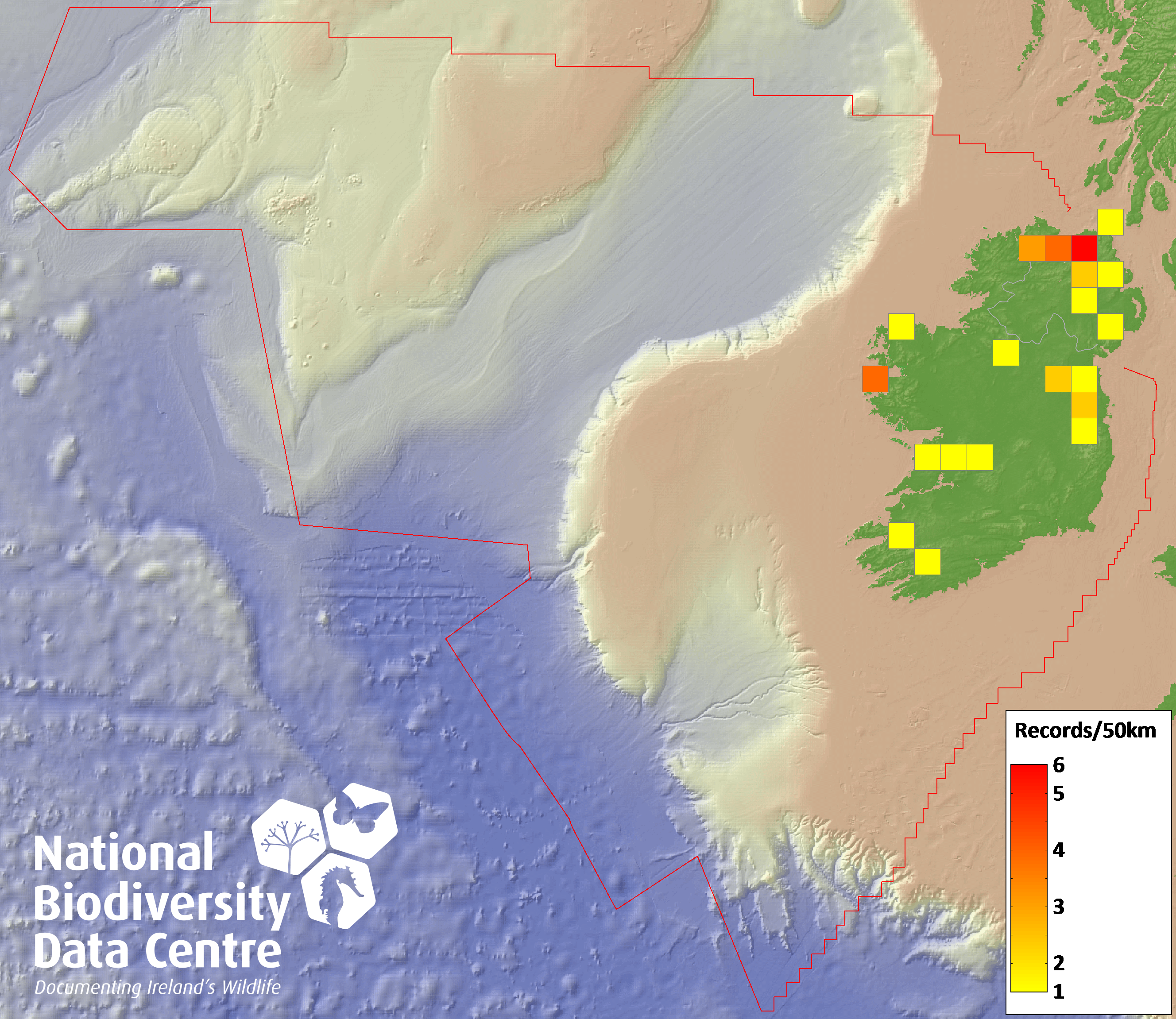 Distribution of the number of records recorded within each 10km grid square (ITM).Marine Map - 50km
