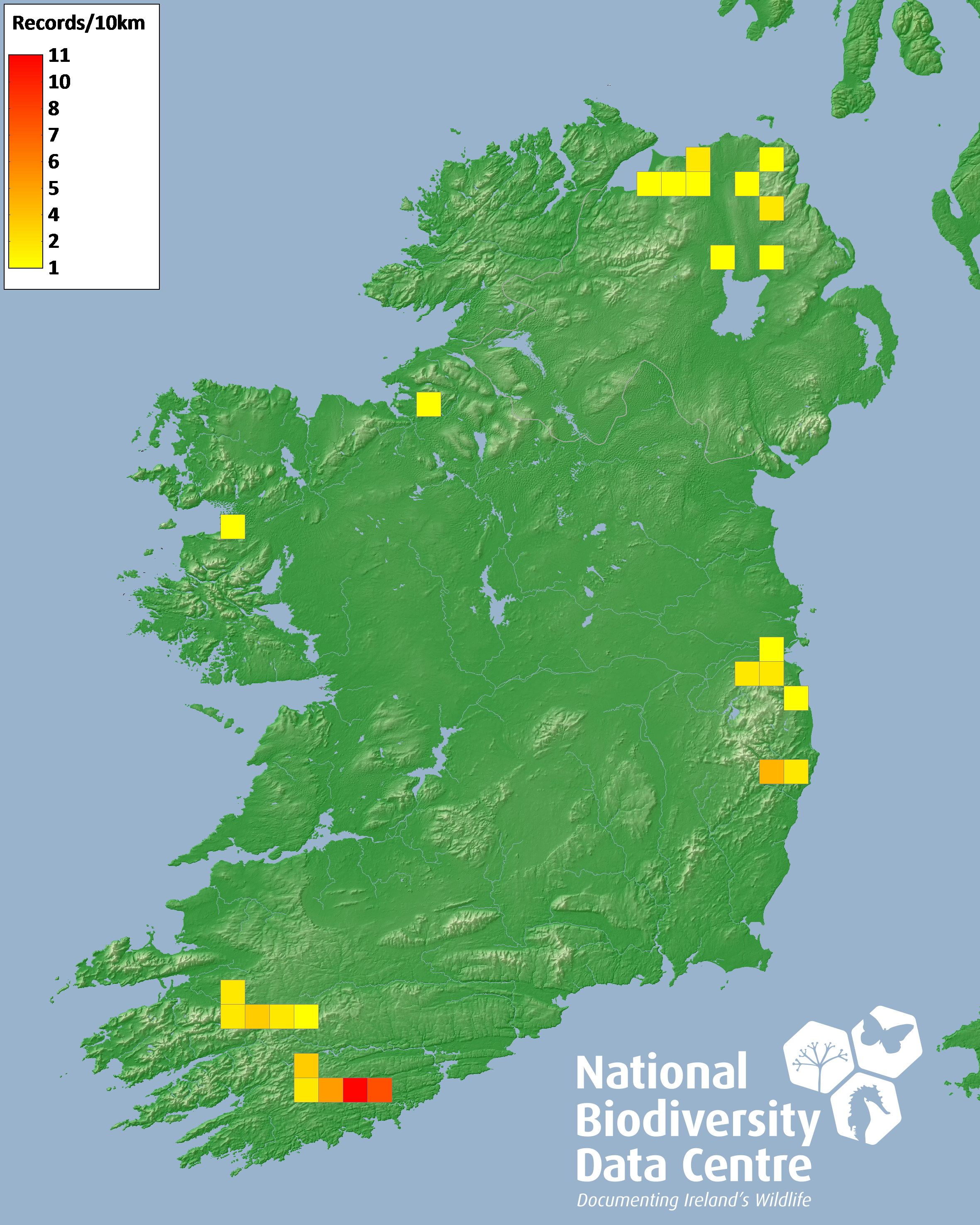 Distribution of the number of records recorded within each 10km grid square (ITM).Marine Map - 50km