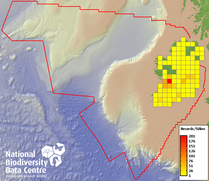 Distribution of the number of records recorded within each 10km grid square (ITM).Marine Map - 50km