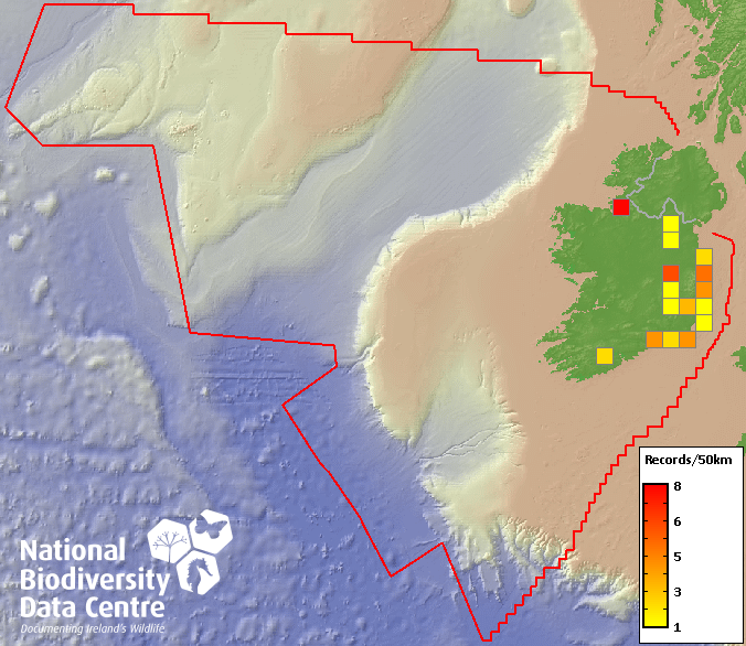 Distribution of the number of records recorded within each 10km grid square (ITM).Marine Map - 50km