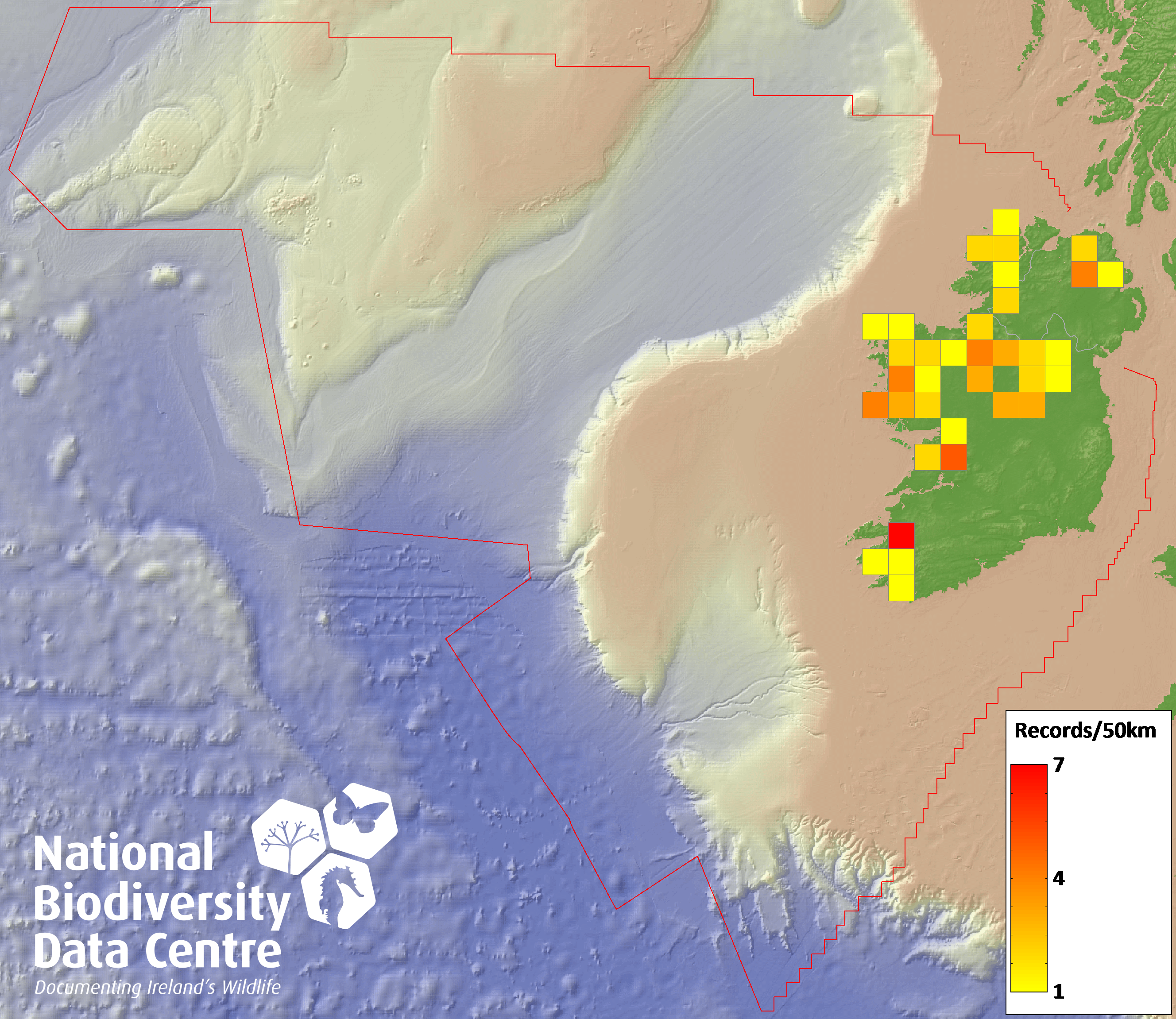 Distribution of the number of records recorded within each 10km grid square (ITM).Marine Map - 50km